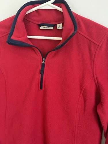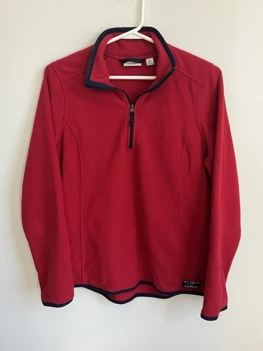 Wrap yourself in the cozy comfort of this L.L. Bean Red Fleece Quarter-Zip Pullover, a vintage-inspired piece that brings a touch of classic warmth to your wardrobe. Designed with a regular fit in mind, it's a versatile medium size that's ideal for layering during those cooler months. The pullover features a soft fleece fabric, ensuring you stay snug whether you're out for a stroll or curled up at home. With its striking red hue complemented by tasteful navy accents, this sweater is a stylish addition to any outfit. The pullover's chic design, coupled with the quality you expect from the L.L. Bean brand, makes it a must-have for those who appreciate both comfort and style. Perfect for a relaxed weekend or a casual day out, this sweater is sure to become a cherished staple in your collection.