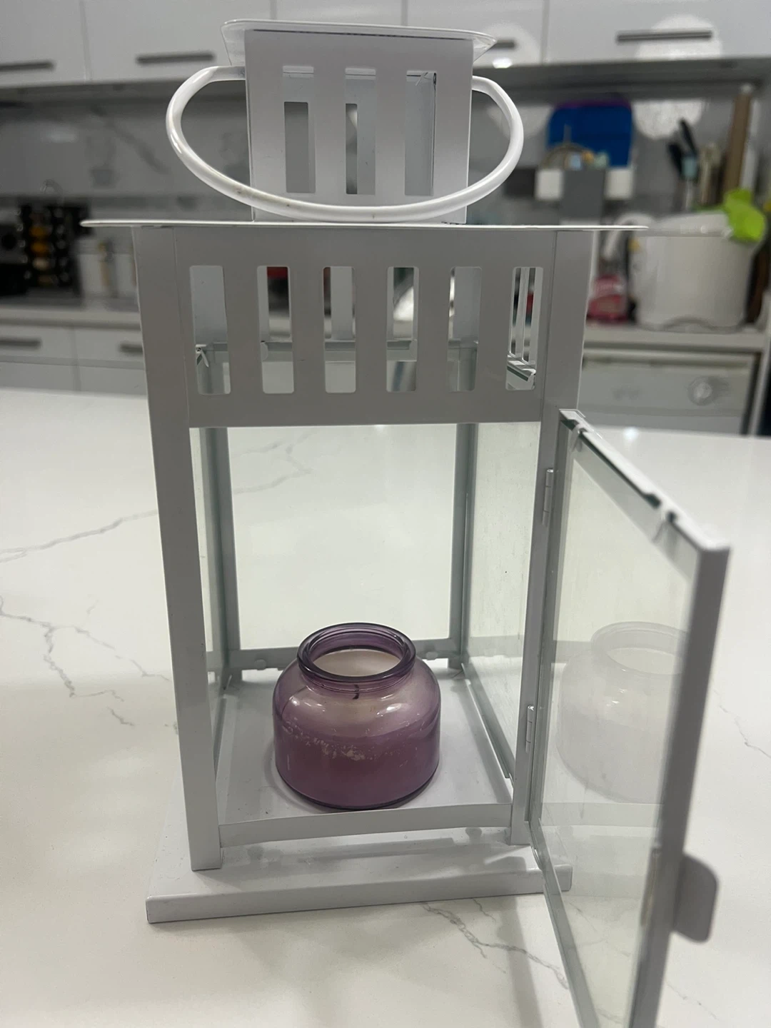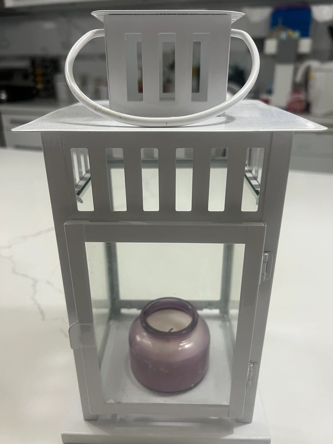 This white metal lantern features glass panels and a decorative handle. It comes with a lavender-scented candle inside. Perfect for adding a cozy ambiance to your home or outdoor space!