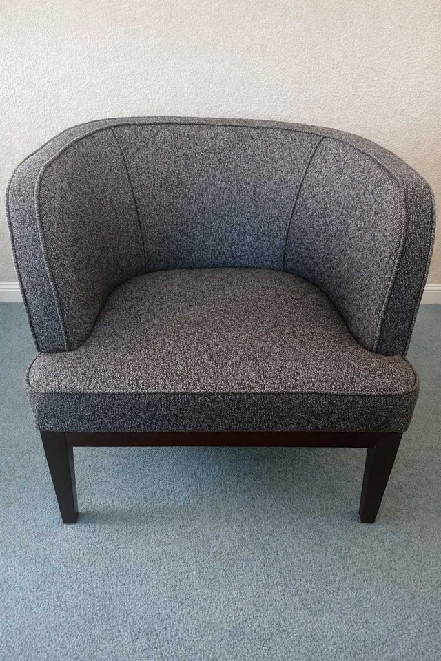 Comfortable tub chair. Few dings on wooden legs, don't have time to paint over them as I'm moving. Can easily be done with a furniture pen from Home Depot or Canadian Tire. Pickup Mission SW