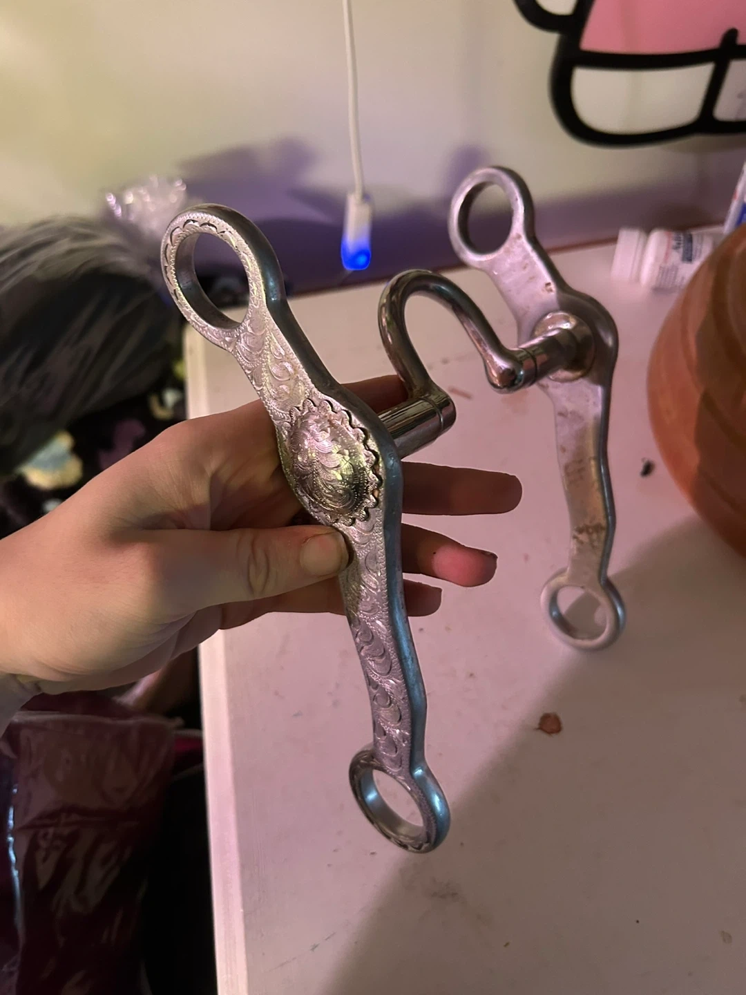 Selling a horse bit with intricate silver engraving. It appears to be in good condition and ready for use.