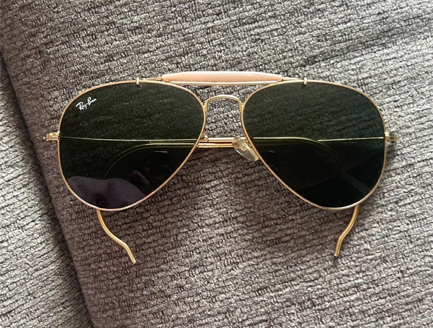 Classic Ray-Ban Outdoorsman II sunglasses with gold metal frame and dark green lenses. They feature the iconic double bridge and leather brow bar. Perfect for sunny days!