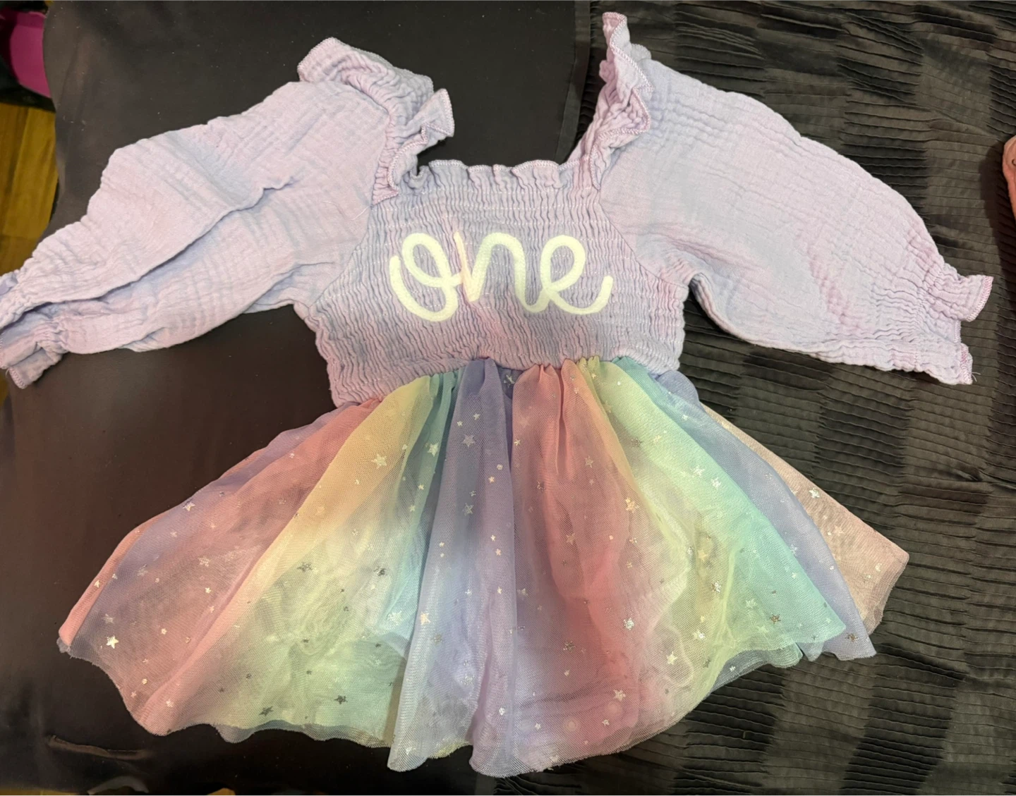 Adorable rainbow tutu dress with a soft purple top and a sparkly rainbow skirt. The dress has 'one' written on the front, perfect for a first birthday or special occasion! It's in great condition and ready for its next adventure.