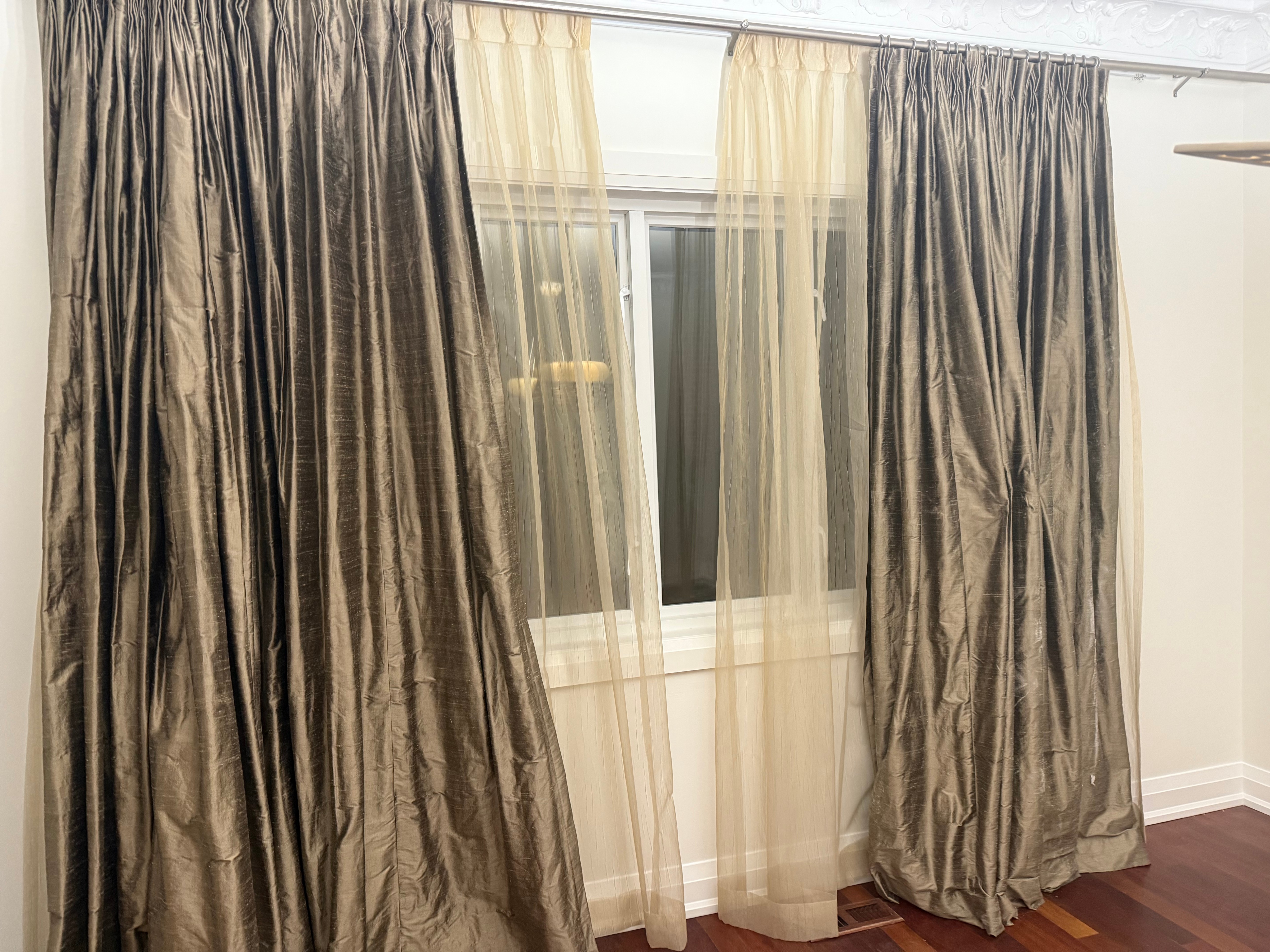 A pair of Sheer and black out silk curtains for sale. They are in great condition. The pair of curtains would be a wonderful addition to any room.