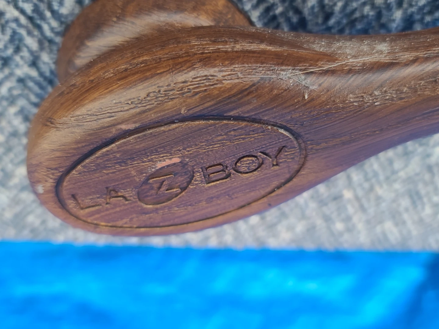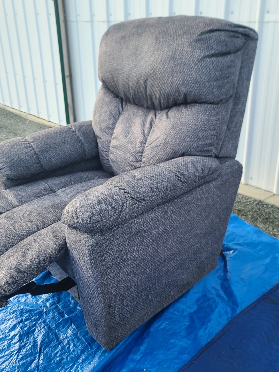 Comfortable La-Z-Boy grey fabric recliner armchair in good condition. Features a smooth manual reclining mechanism with side handle, plush padded seat, high back, and wide armrests for excellent support. Measurements: W 35" X D 28" X H 39". Delivery can be arranged. Viewing and pickup by appointment.