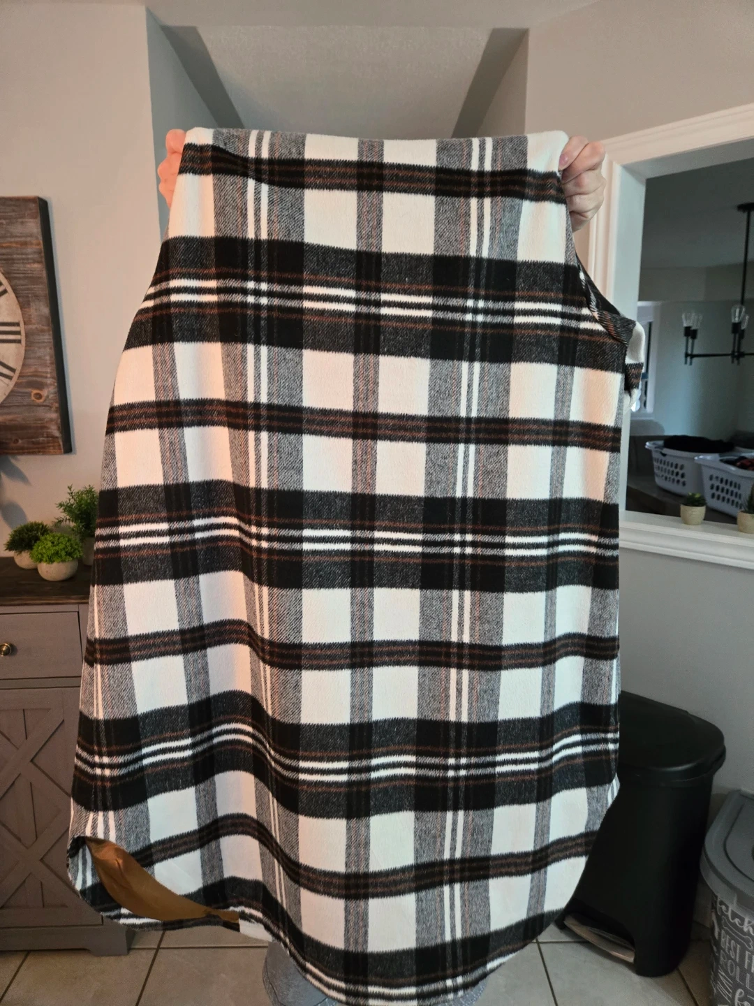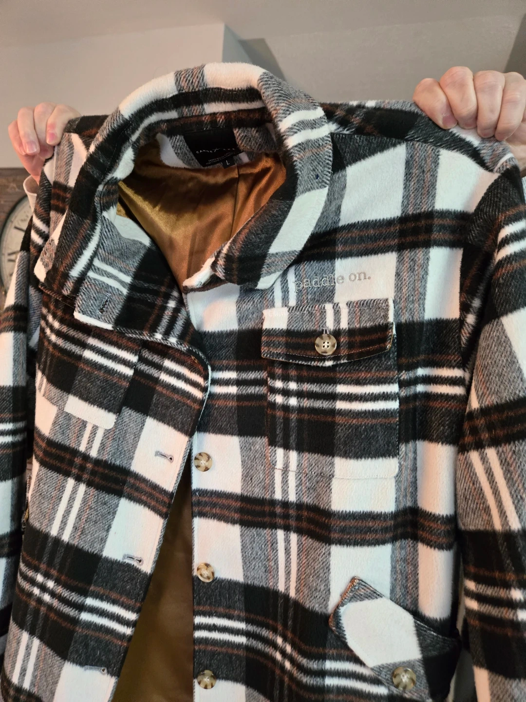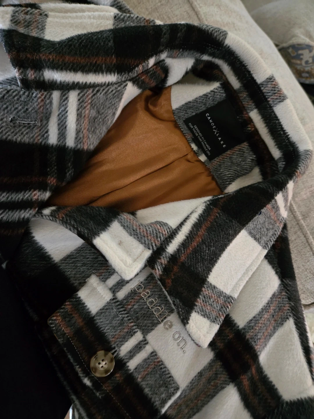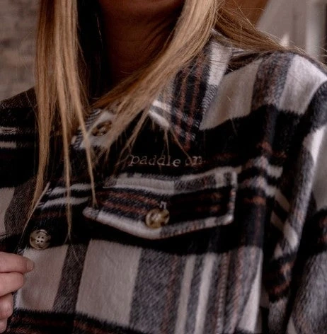 This Canoe & Lake jacket features a black, white, and rust plaid pattern. It's lined with a satin-like material. The jacket is embroidered with "paddle on."