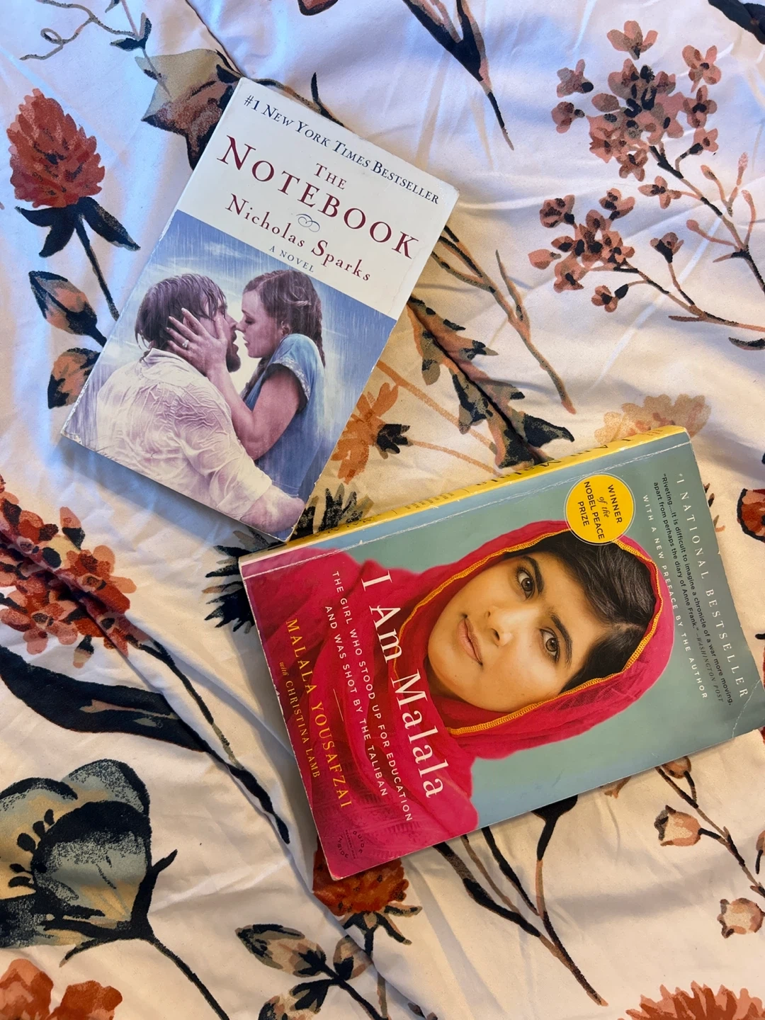 Two bestselling books included: 'The Notebook' by Nicholas Sparks and 'I Am Malala' by Malala Yousafzai. Both are novels and non-fiction accounts of inspirational stories. Moving sale, only cash.