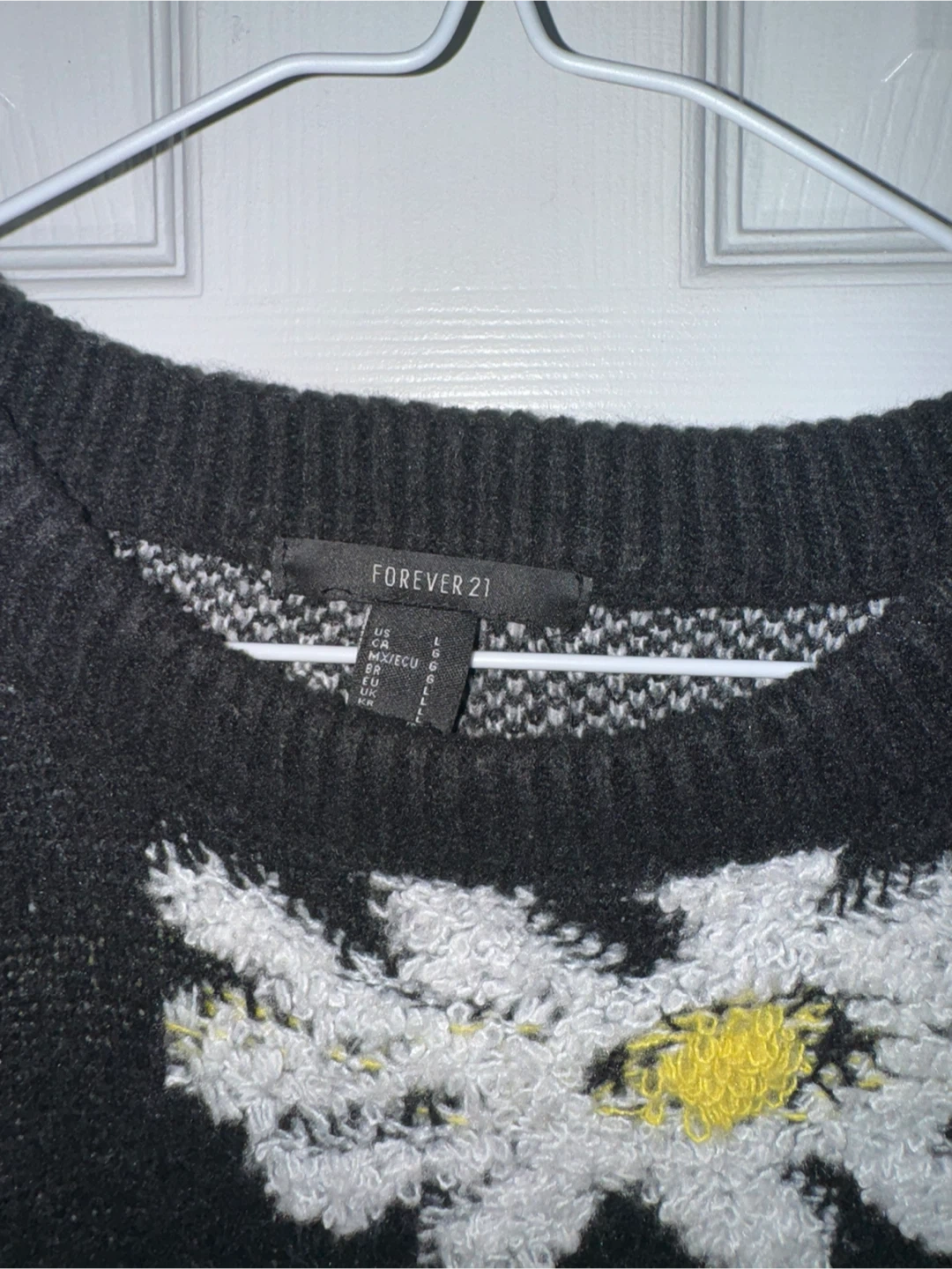 Here's a cute Forever 21 sweater with a daisy pattern! It's black with white and yellow daisies, and it's a size large. Perfect for adding a bit of floral fun to your wardrobe