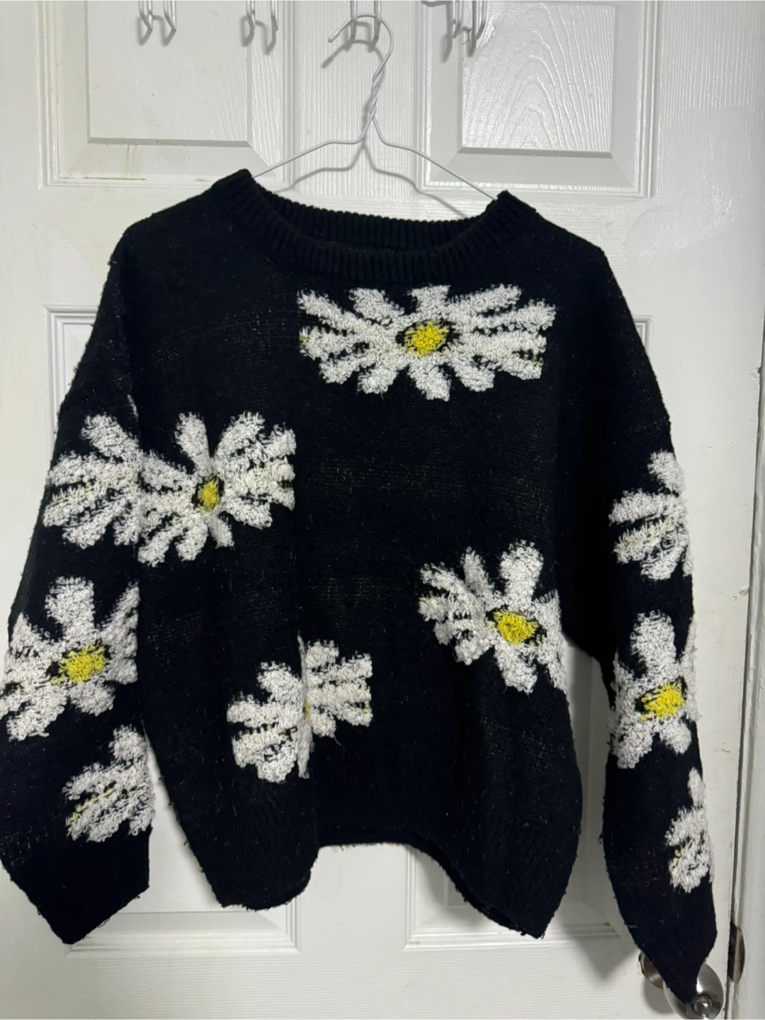 Here's a cute Forever 21 sweater with a daisy pattern! It's black with white and yellow daisies, and it's a size large. Perfect for adding a bit of floral fun to your wardrobe