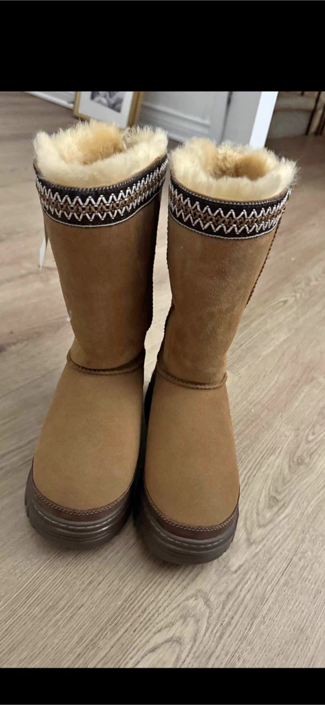 These stylish brown suede boots are lined with cozy sheepskin for warmth. They feature a decorative embroidered trim around the cuff. The durable sole offers good traction.