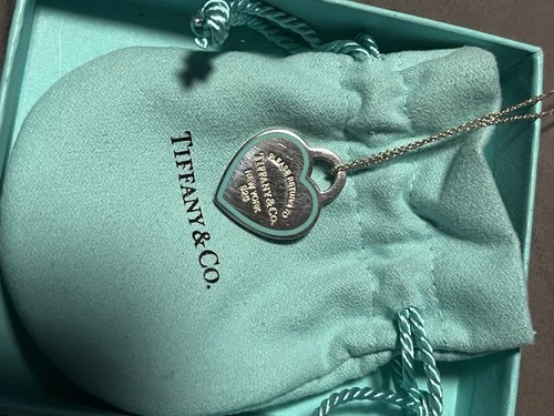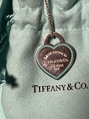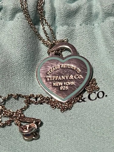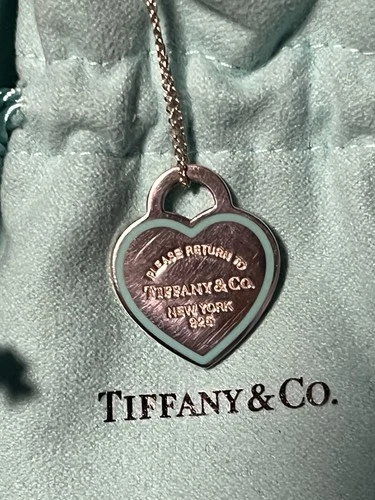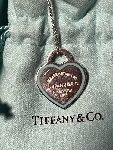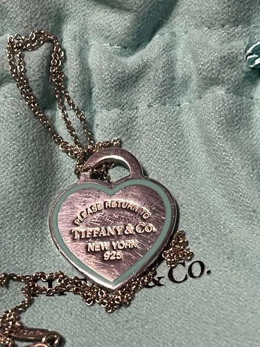 Please return to Tiffany and co heart with blue outline necklace in good conditions. Needs a polish and cleaning. Used conditions. See pictures for reference.