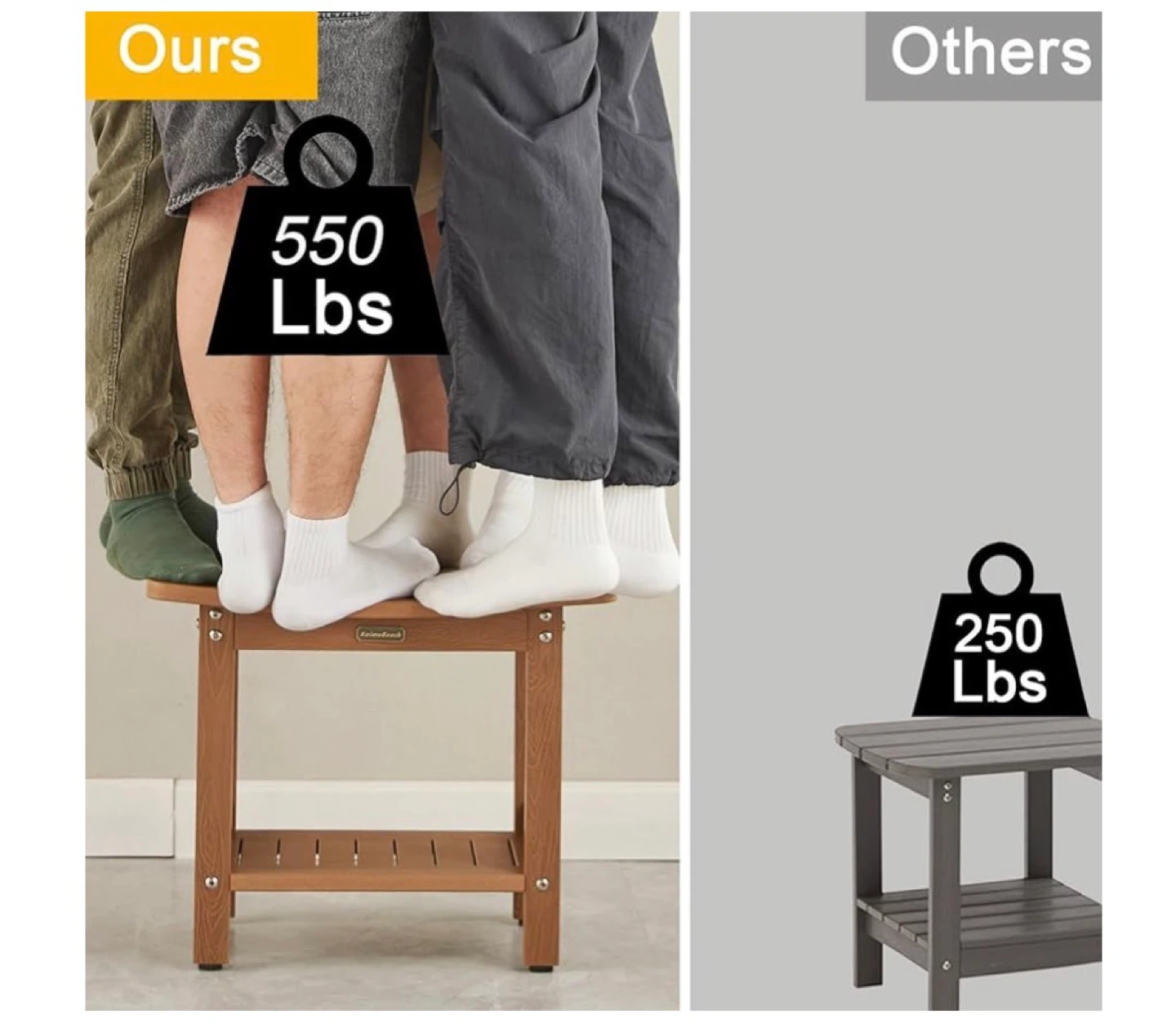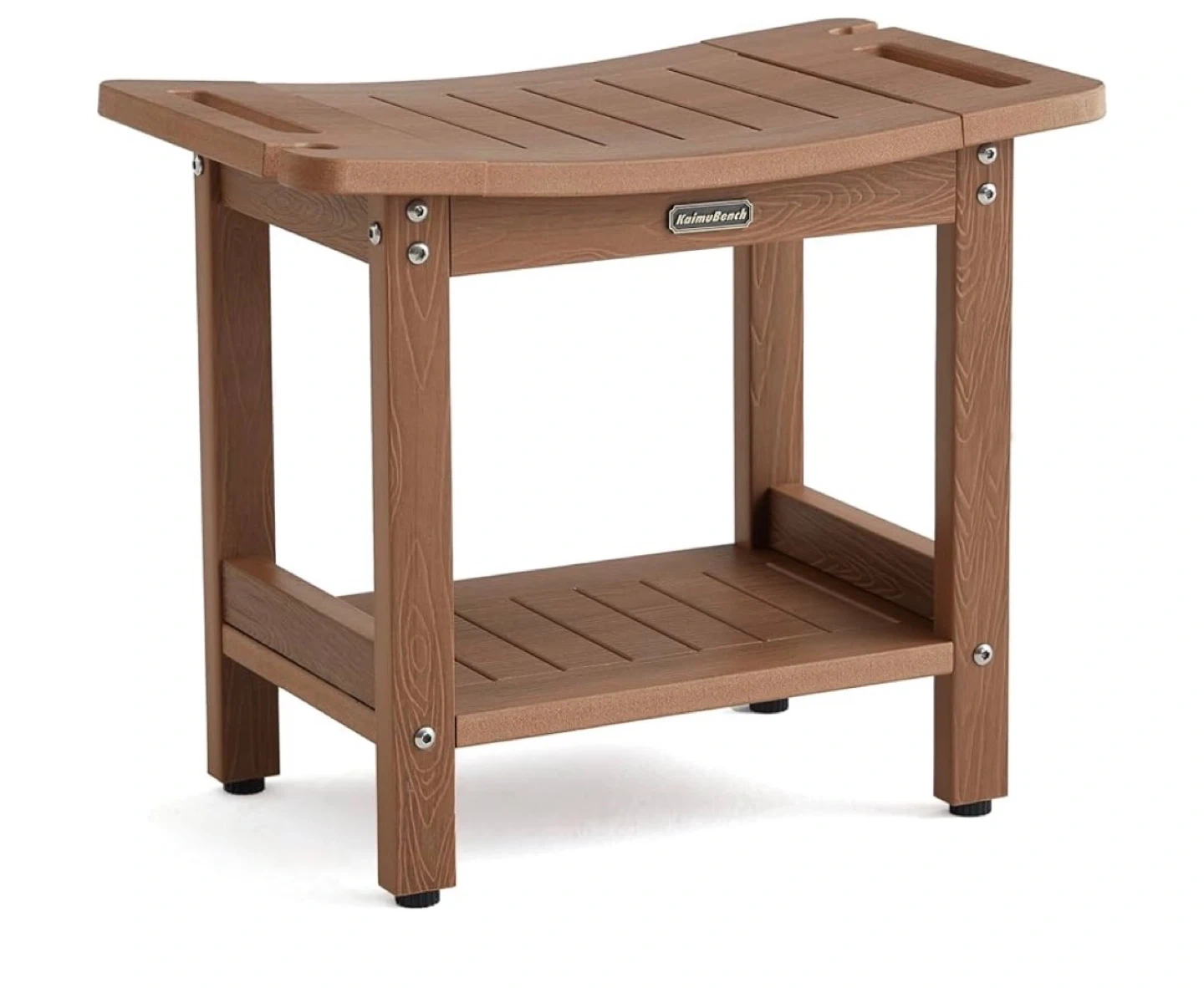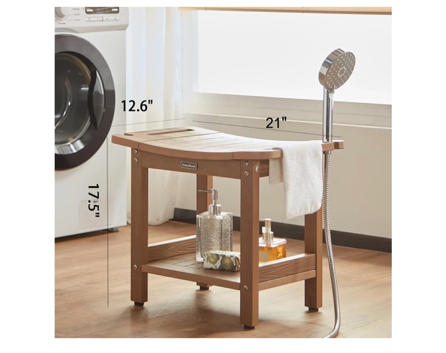 Kaimu Beach shower bench seat in a wood-look finish. It's non-moldy and waterproof. Dimensions are 21" L x 12.6" W x 17.5" H. Supports up to 550 lbs.