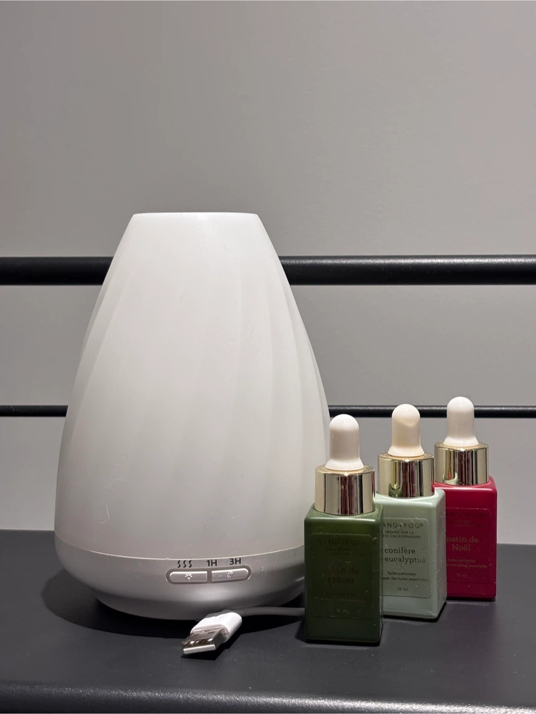 - One White ultrasonic essential oil diffuser with a USB cord. Includes three London Sand Fog 10ml essential oil bottles.