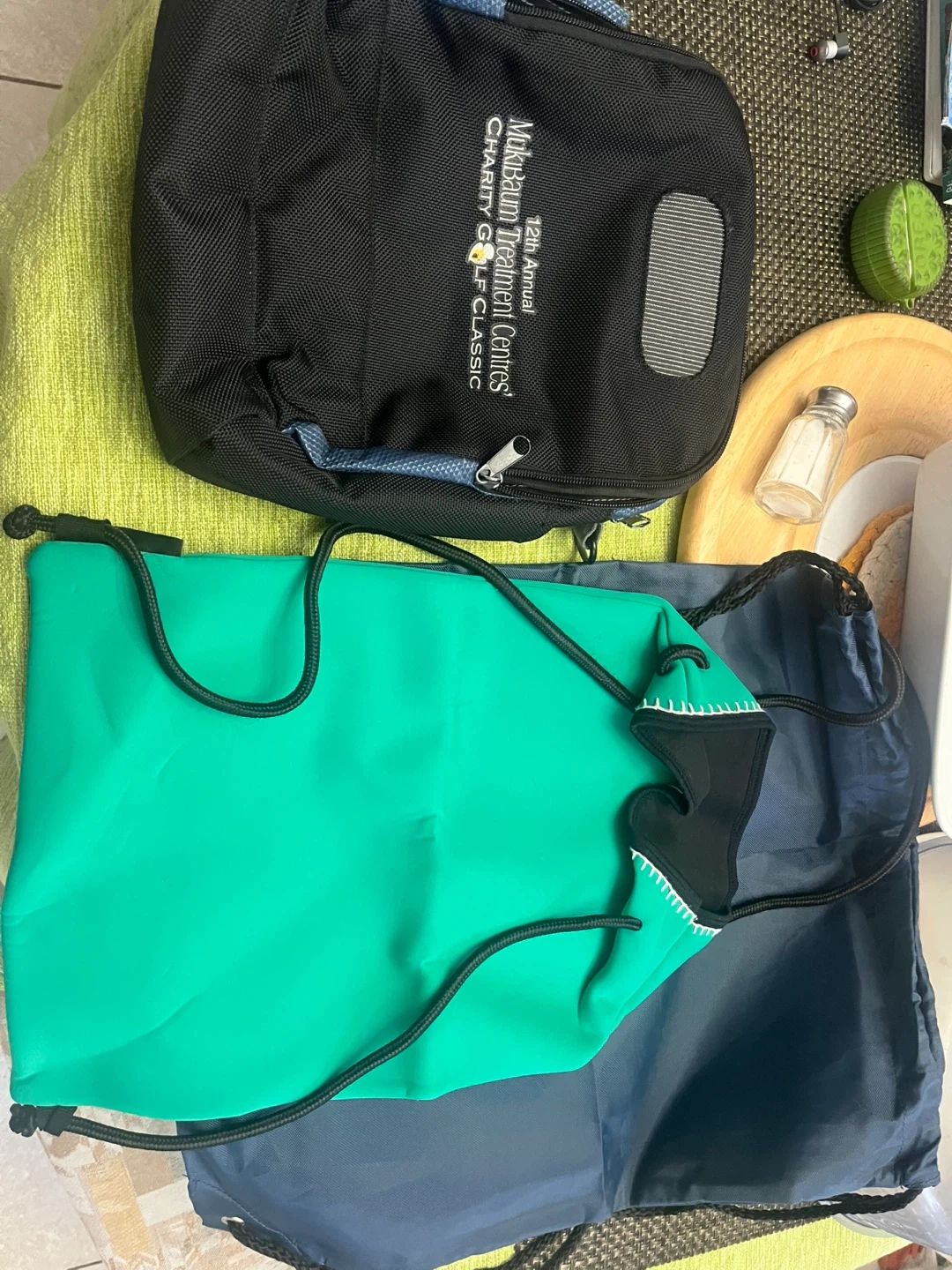 Includes a black duffel bag from the 12th Annual Markham Treatment Centres Charity Golf Classic. Also comes with a bright green and a navy blue drawstring bag. The navy bag has 'VOYAGEURS' printed on it.