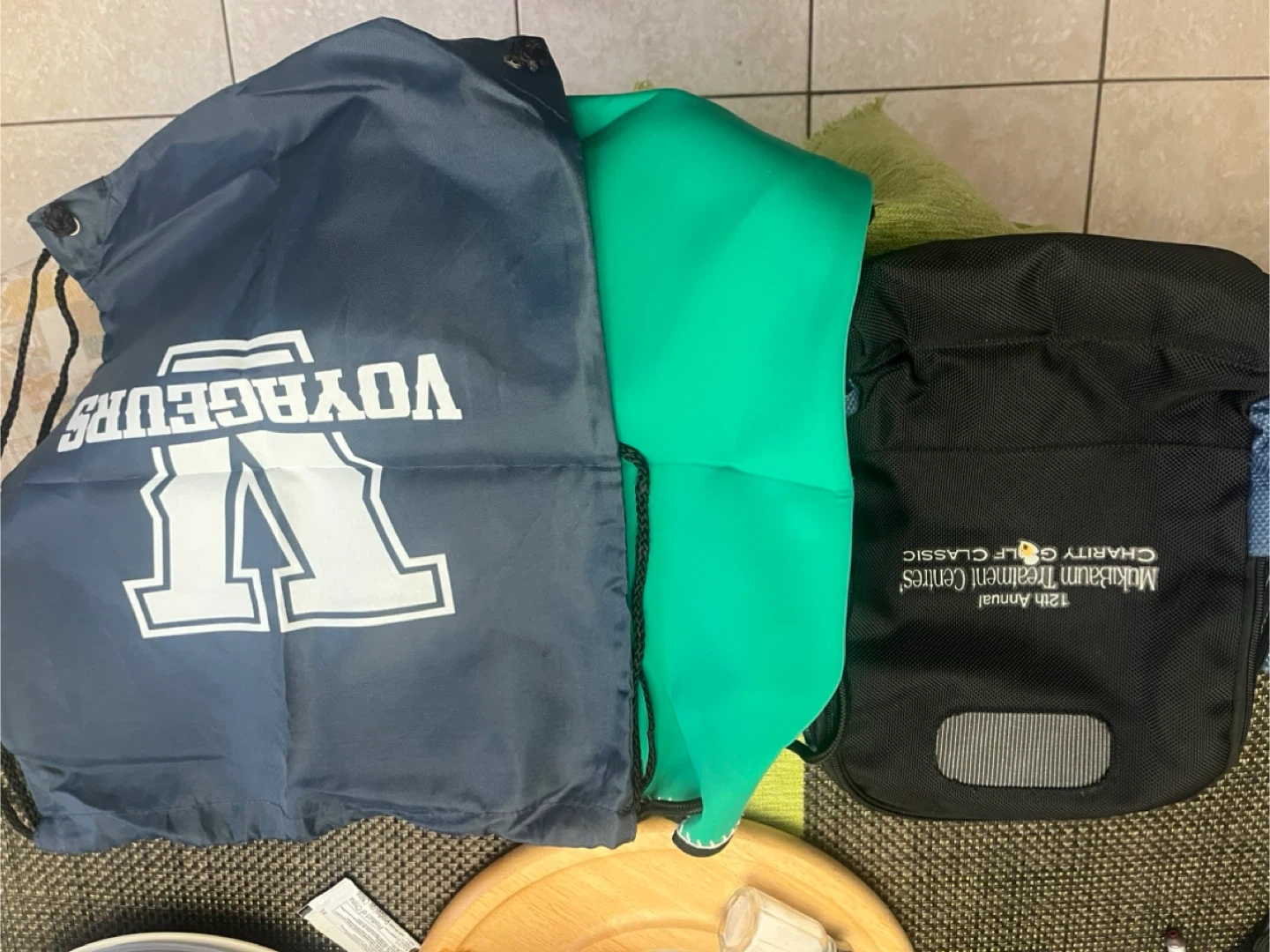 Includes a black duffel bag from the 12th Annual Markham Treatment Centres Charity Golf Classic. Also comes with a bright green and a navy blue drawstring bag. The navy bag has 'VOYAGEURS' printed on it.