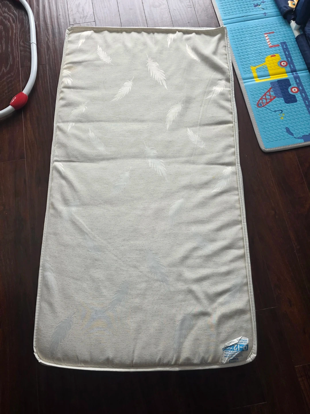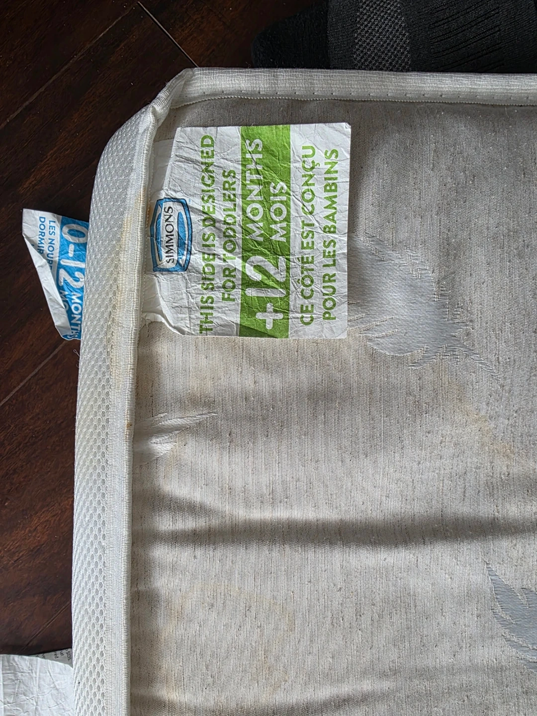 This Simmons crib mattress is designed for infants and toddlers. It's reversible, with one side for infants and the other for toddlers up to 12 months. The cover has a subtle feather pattern.