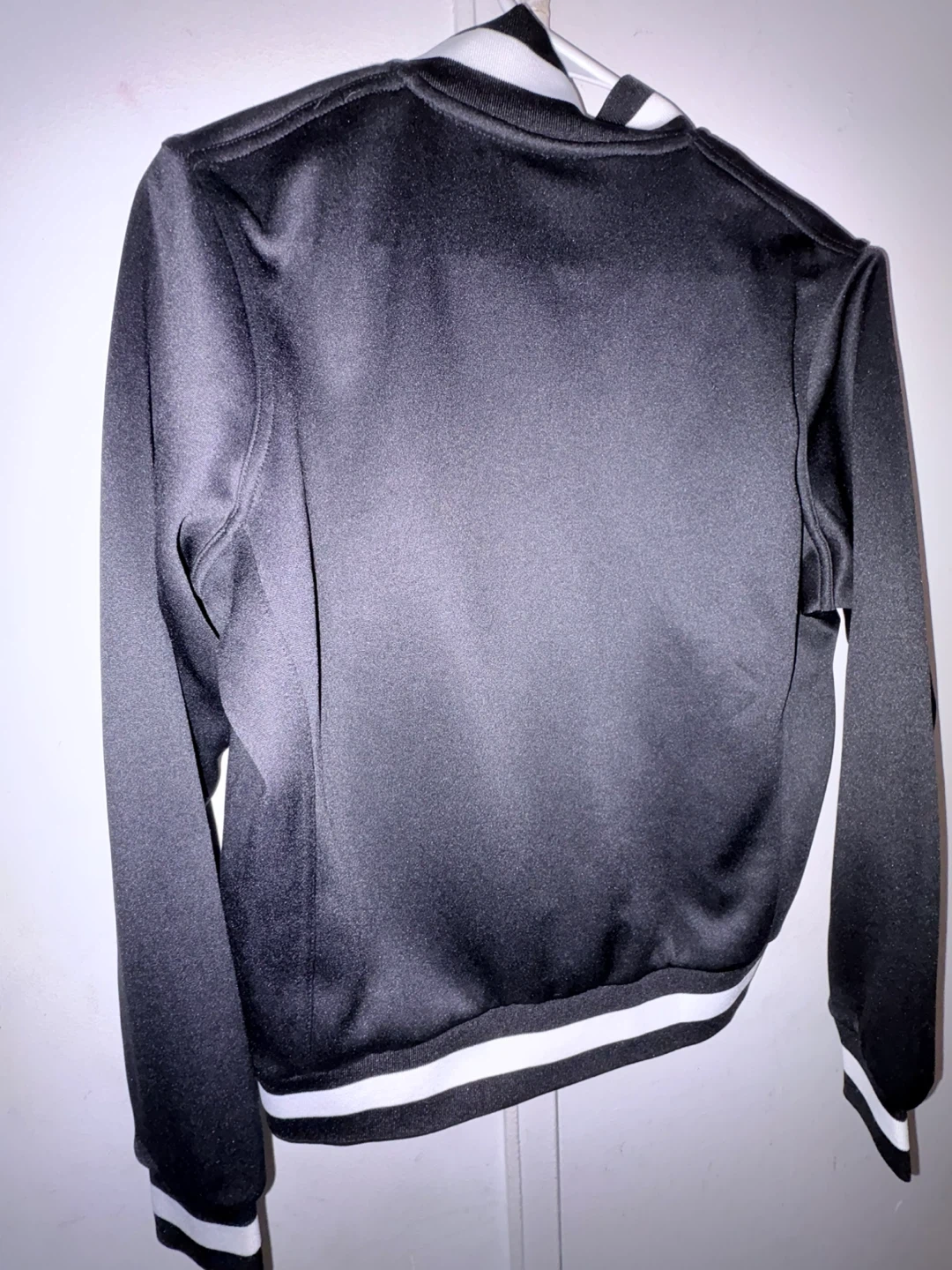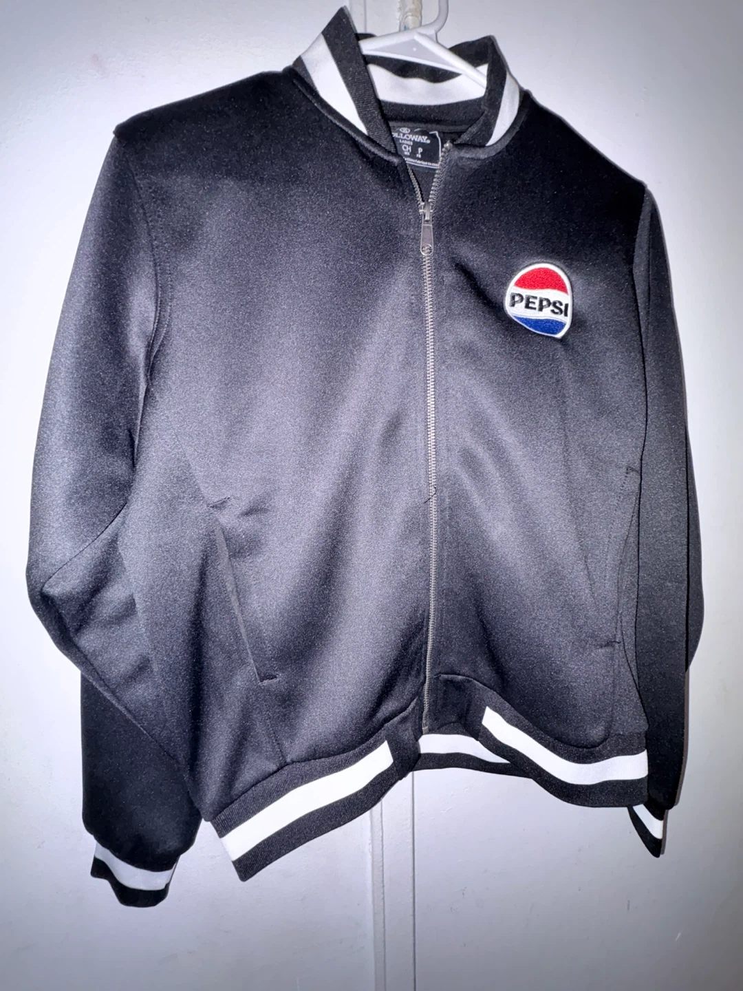 This is a black Holloway brand track jacket with a Pepsi logo on the chest. It features white striped cuffs and collar. Size S.