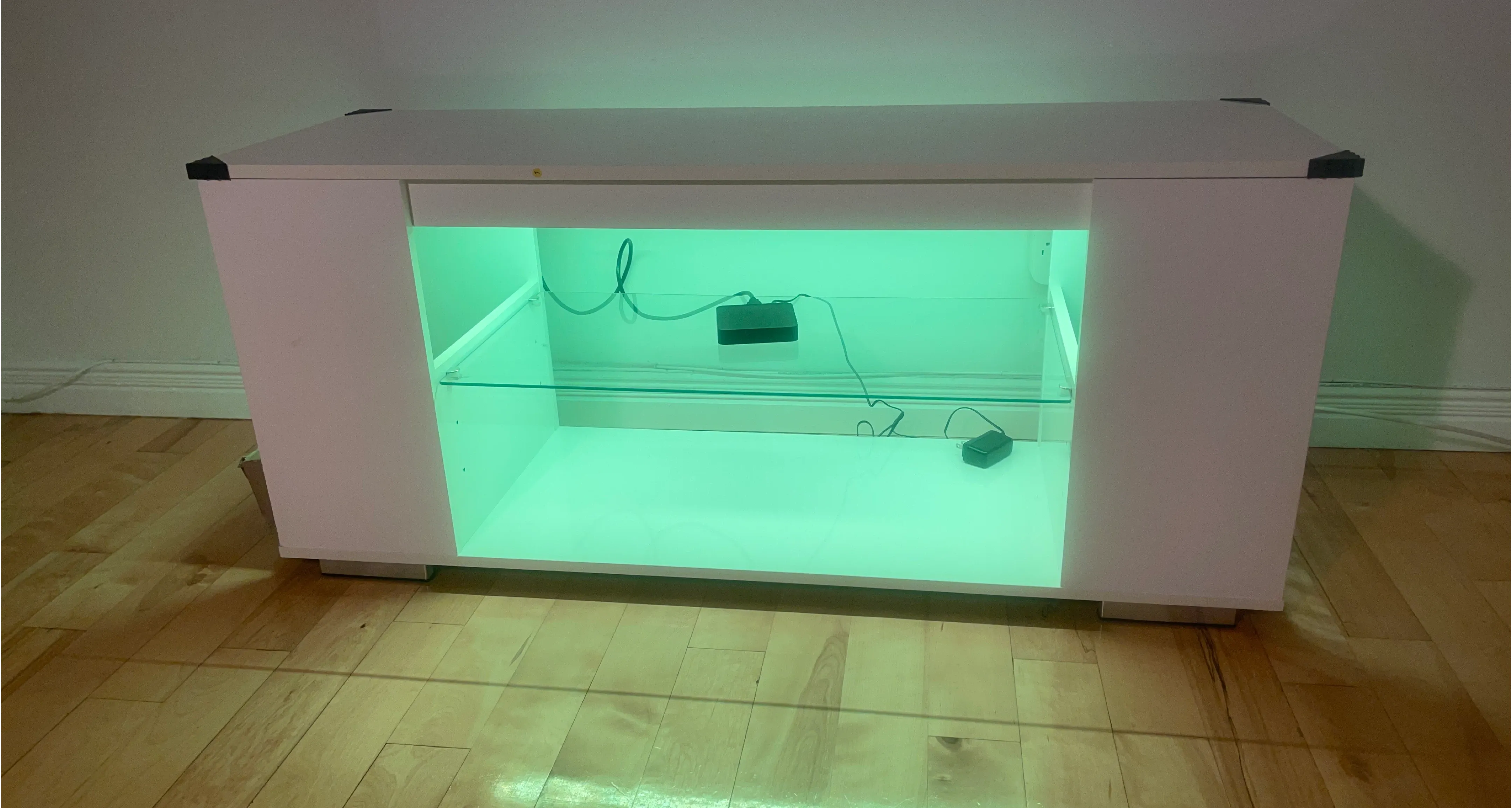 Meuble TV blanc avec une étagère en verre et un éclairage DEL vert intégré. Dimensions : L. 120 cm x H. 40 cm x P. 35 cm. Il est en bon état, prêt à accueillir votre téléviseur et vos appareils. L'éclairage ajoute une ambiance moderne à votre salon !