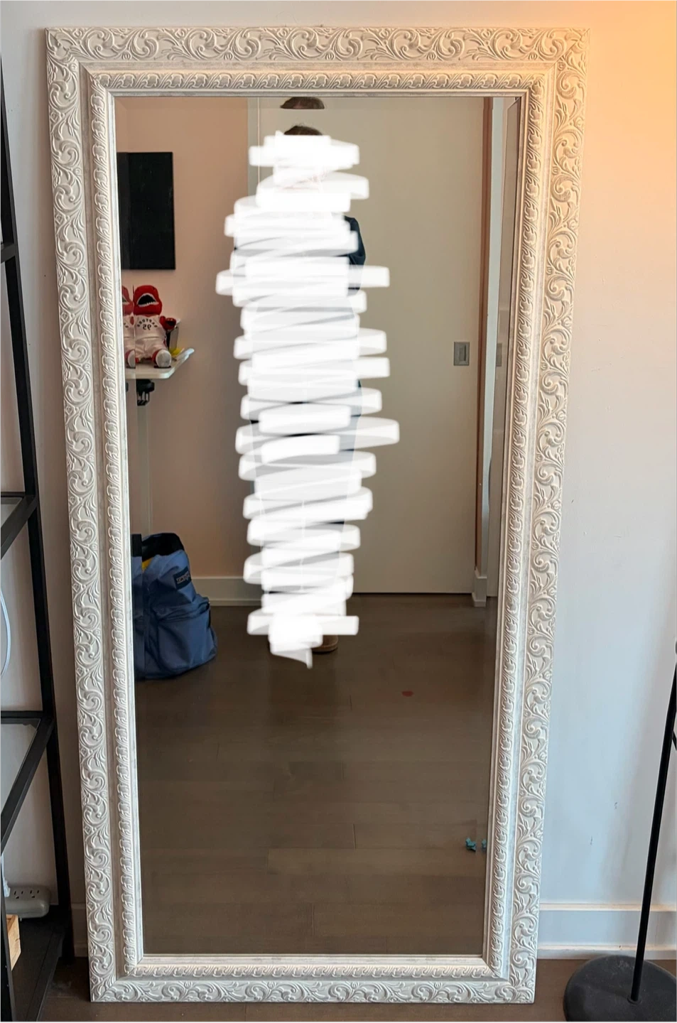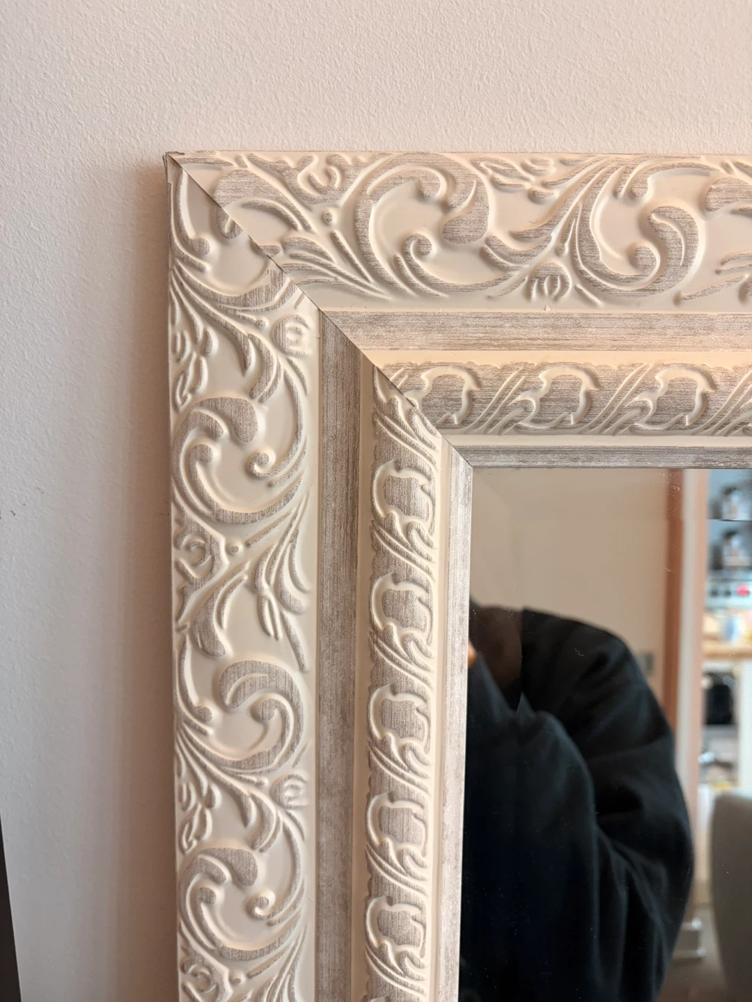 A full-length floor mirror with a white ornate frame. It's a beautiful accent piece for any room. The frame has intricate detailing.