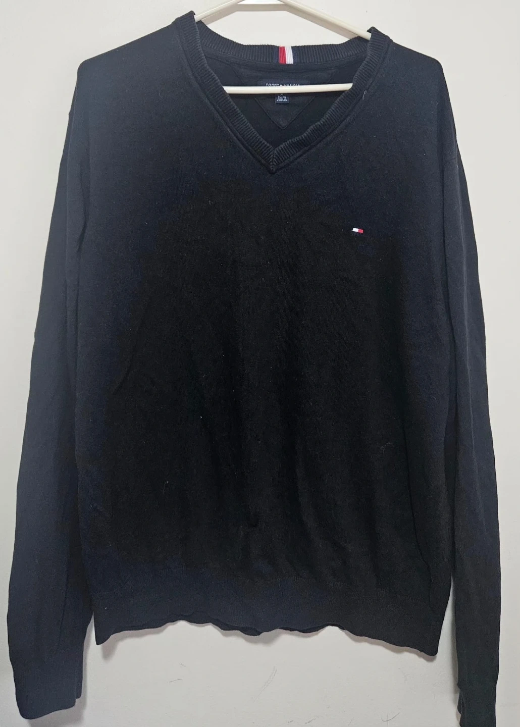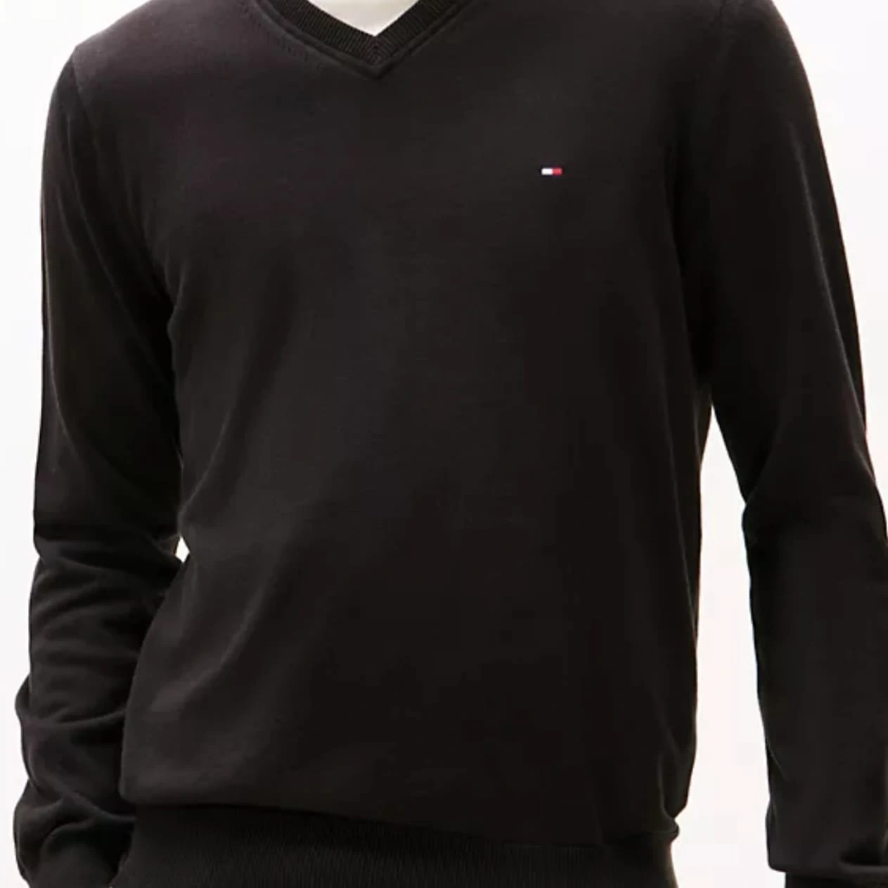 Classic black V-neck sweater from Tommy Hilfiger. Long sleeves and a comfortable fit. It's made from a soft knit material. This sweater is a great layering piece for any wardrobe!