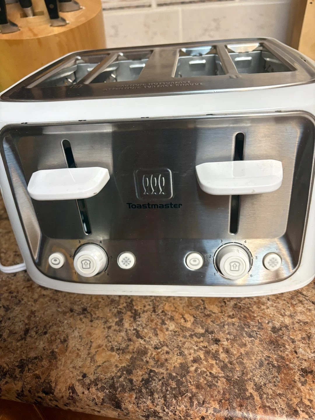 White and stainless steel Toastmaster 4 slice toaster. It has multiple browning settings and functions for toasting, reheating, and defrosting. This toaster is a practical kitchen appliance for daily use.