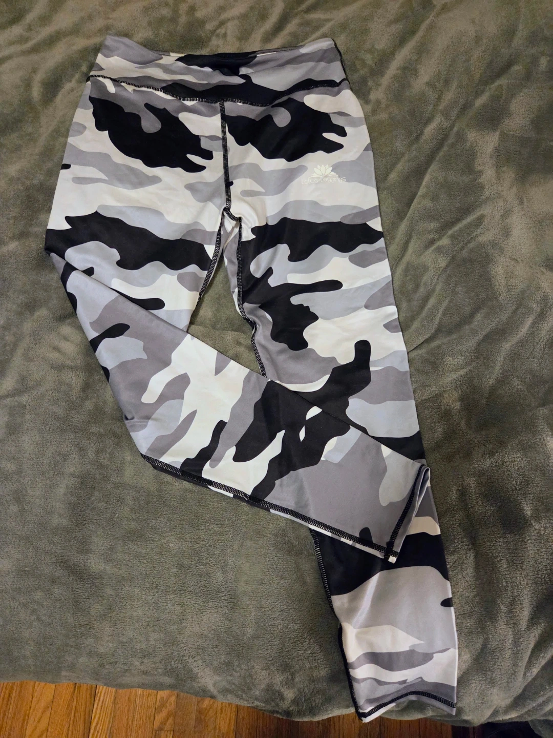 Selling a pair of Lotus Leggings in size L! They feature a cool camouflage pattern and are made from 88% polyester and 12% elastane. These leggings are perfect for workouts or everyday wear!