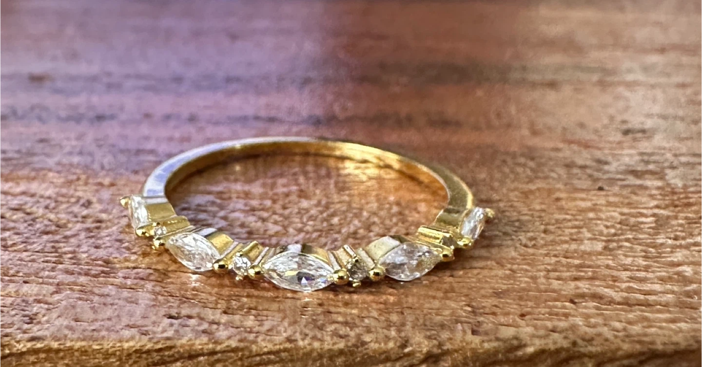 Beautiful gold-tone ring set with marquise cut stones and small clear accents. This ring is stamped with 925, indicating sterling silver. It's a lovely piece for everyday wear.