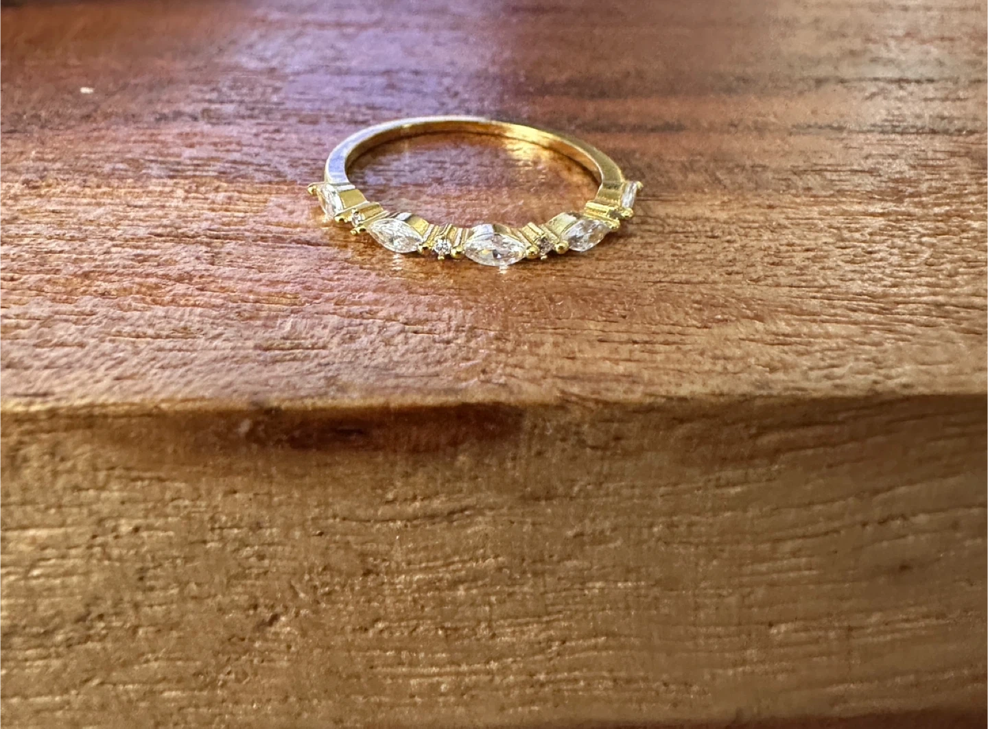 Beautiful gold-tone ring set with marquise cut stones and small clear accents. This ring is stamped with 925, indicating sterling silver. It's a lovely piece for everyday wear.