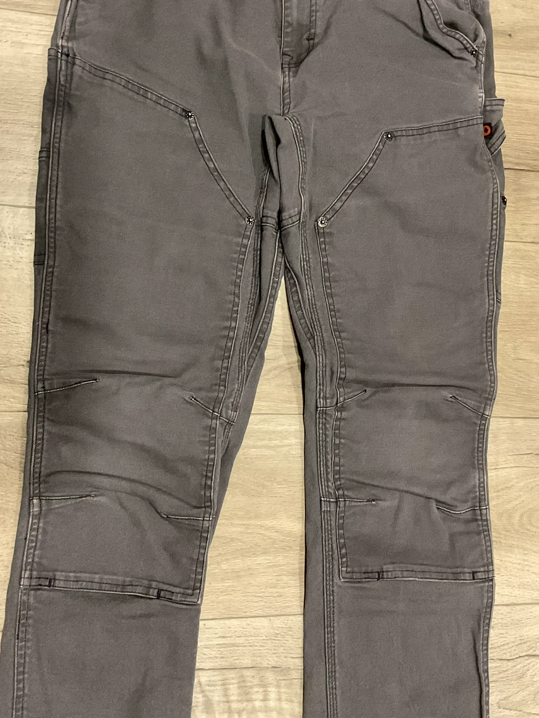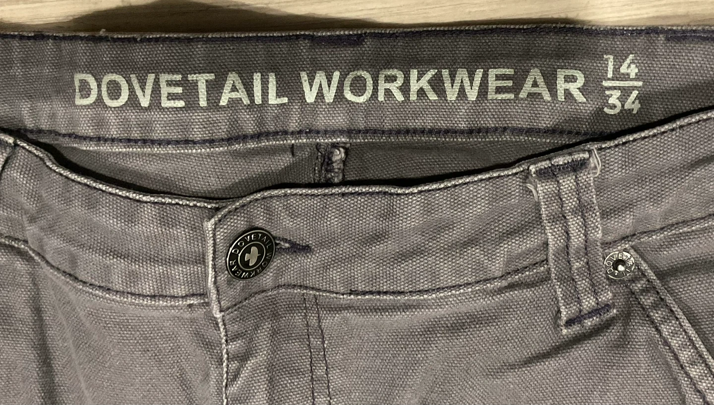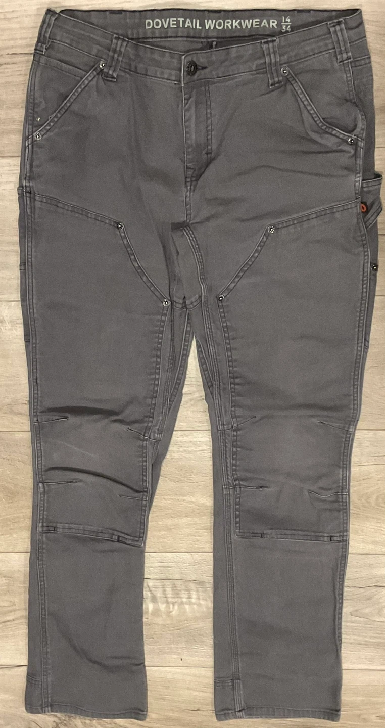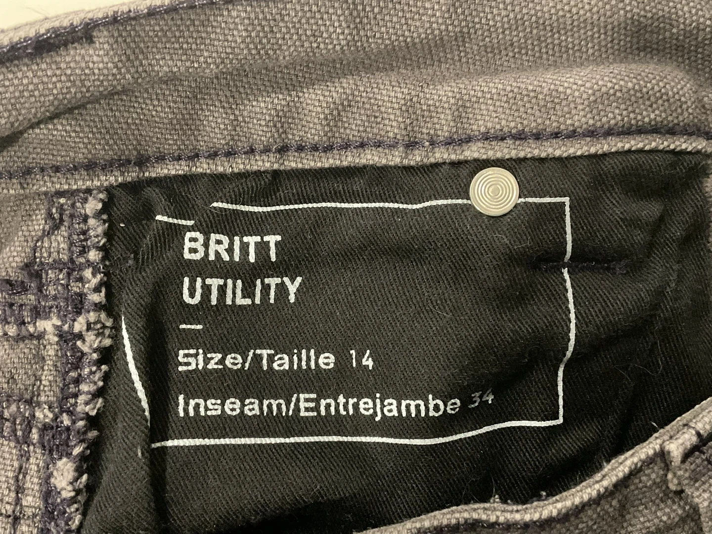 Selling a pair of Dovetail Workwear Britt Utility pants in size 14/34. They're a stylish and functional option for work or everyday wear. The pants are made of durable grey canvas material and feature multiple utility pockets for added convenience