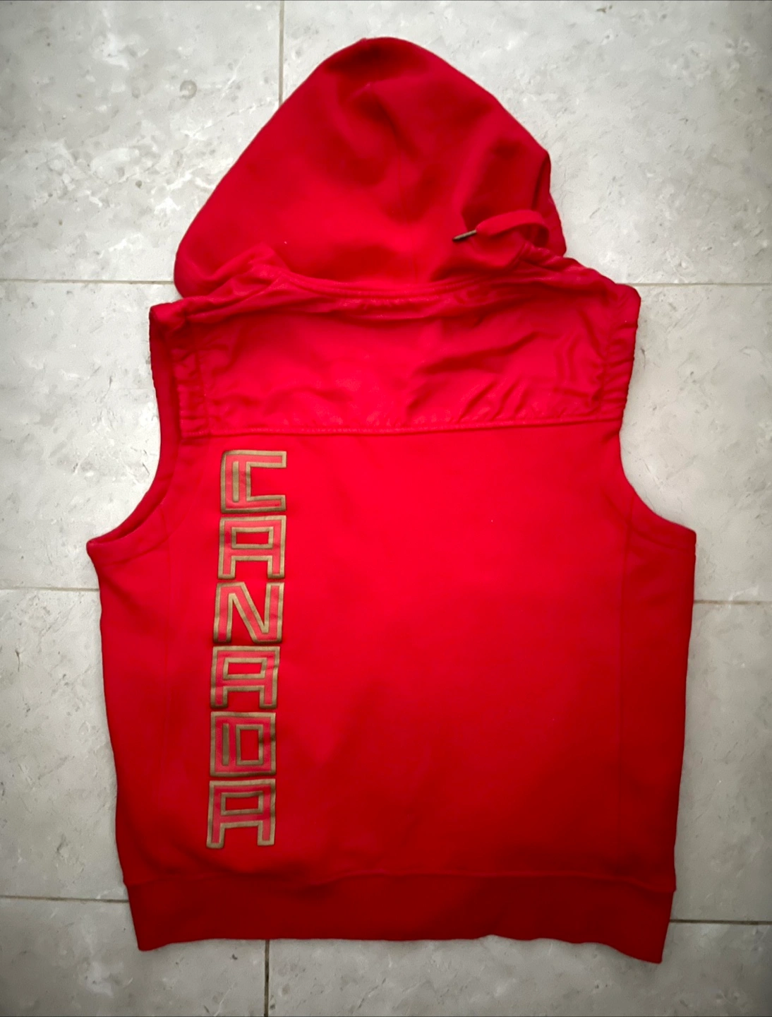 The Bay 2008 Olympics red sleeveless zip-up hoodie with gold accents. Features a hood and full zip closure. Great for layering during cooler weather! Men’s size medium