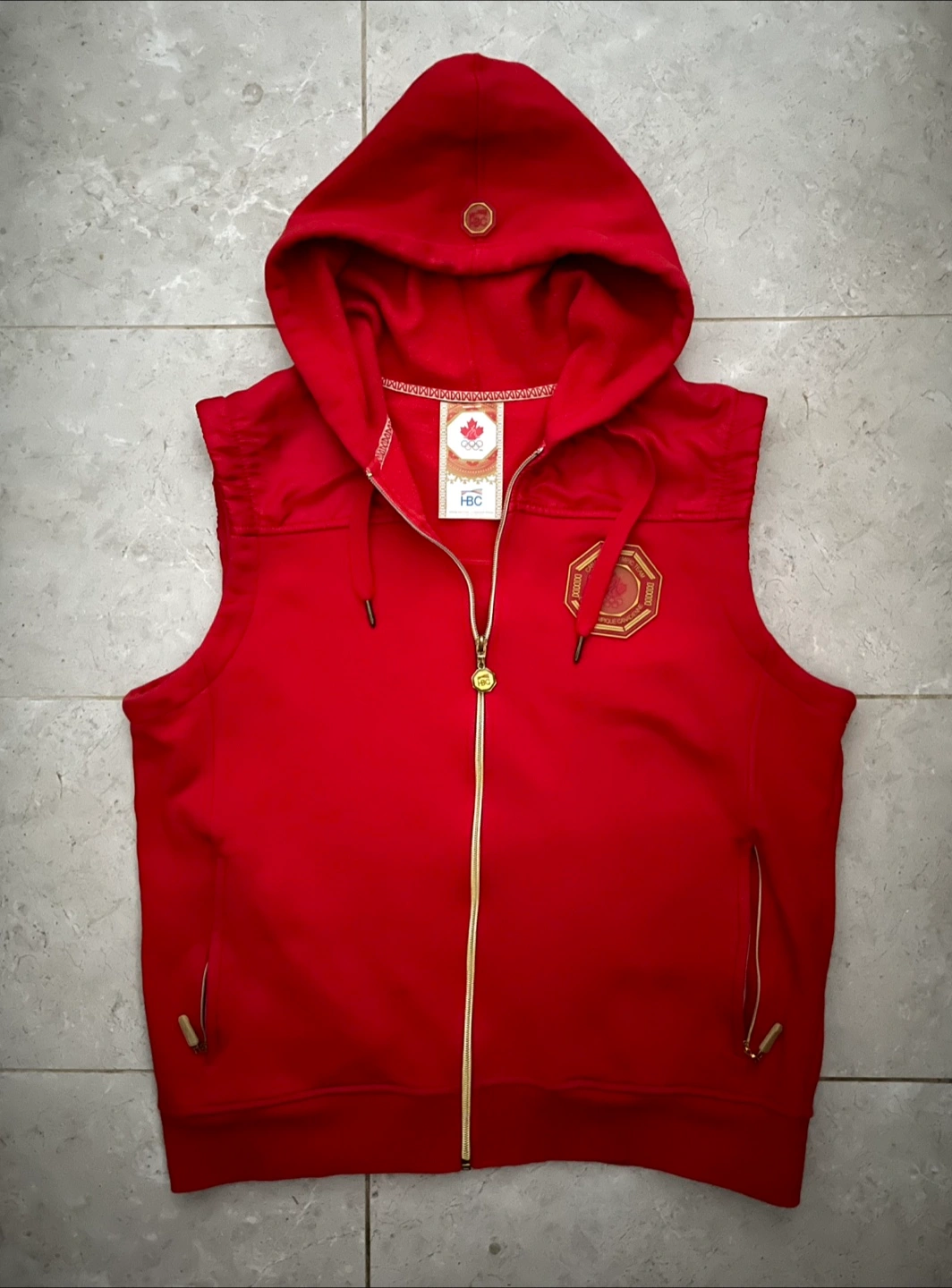 The Bay 2008 Olympics red sleeveless zip-up hoodie with gold accents. Features a hood and full zip closure. Great for layering during cooler weather! Men’s size medium