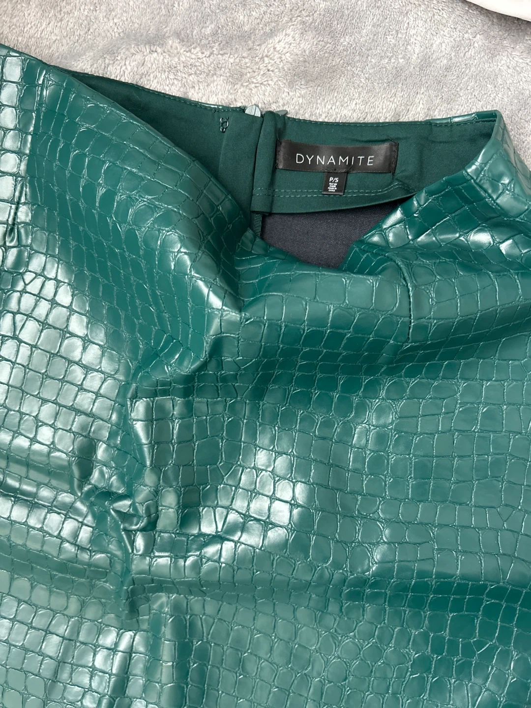 Dynamite mini skirt with a faux crocodile texture. It's a size 5 and has a rich green colour. Perfect for adding some flair to your outfit!