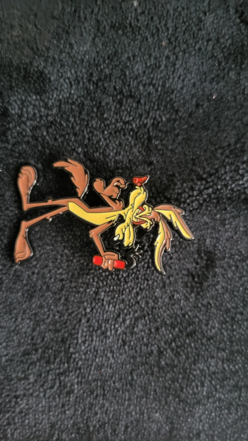 Set of enamel pins featuring cartoon characters including the Seven Dwarfs, Snow White, and Wile E. Coyote. These pins are made of metal and enamel. They're great for decorating jackets or bags! 5.00 each