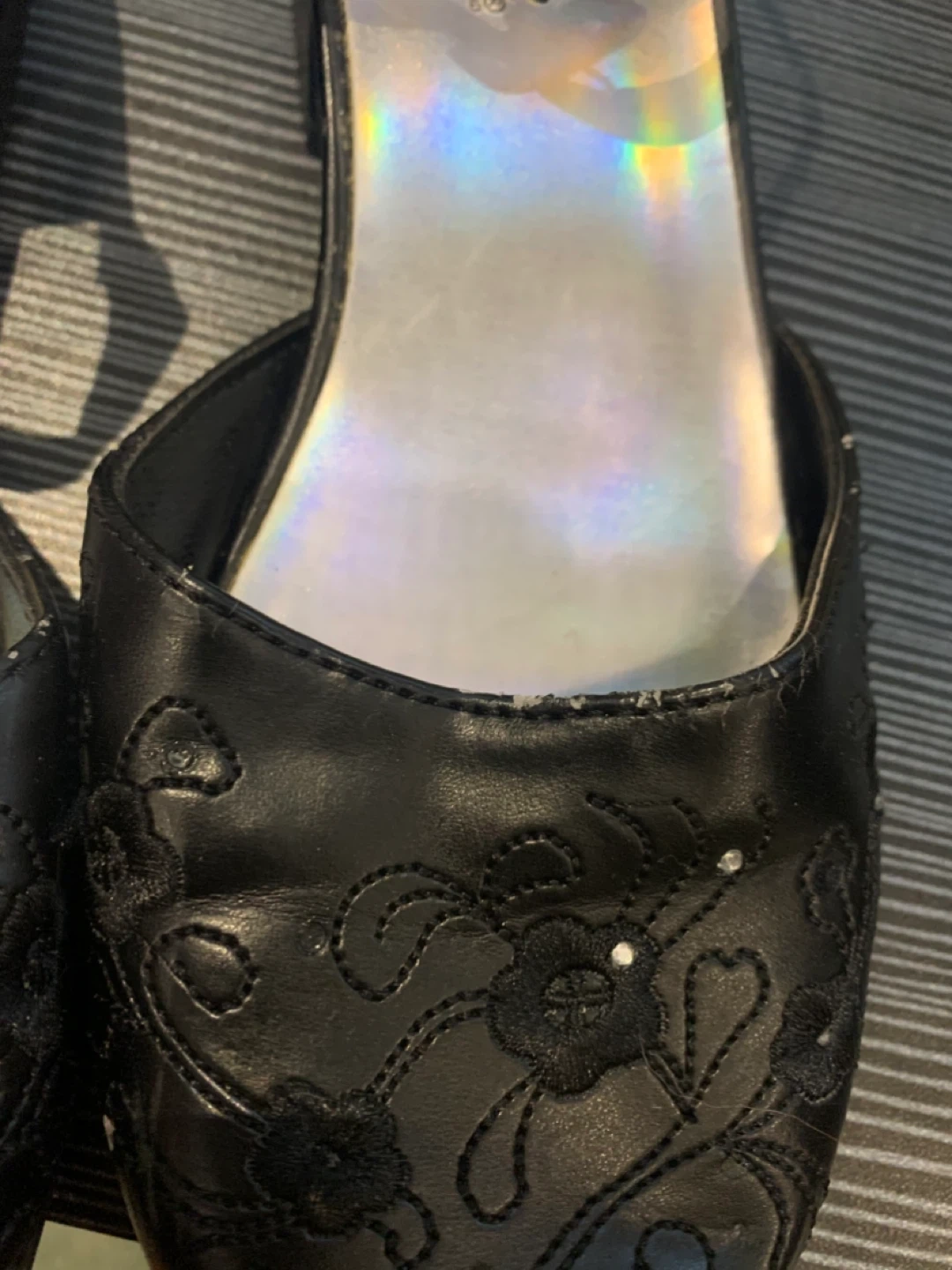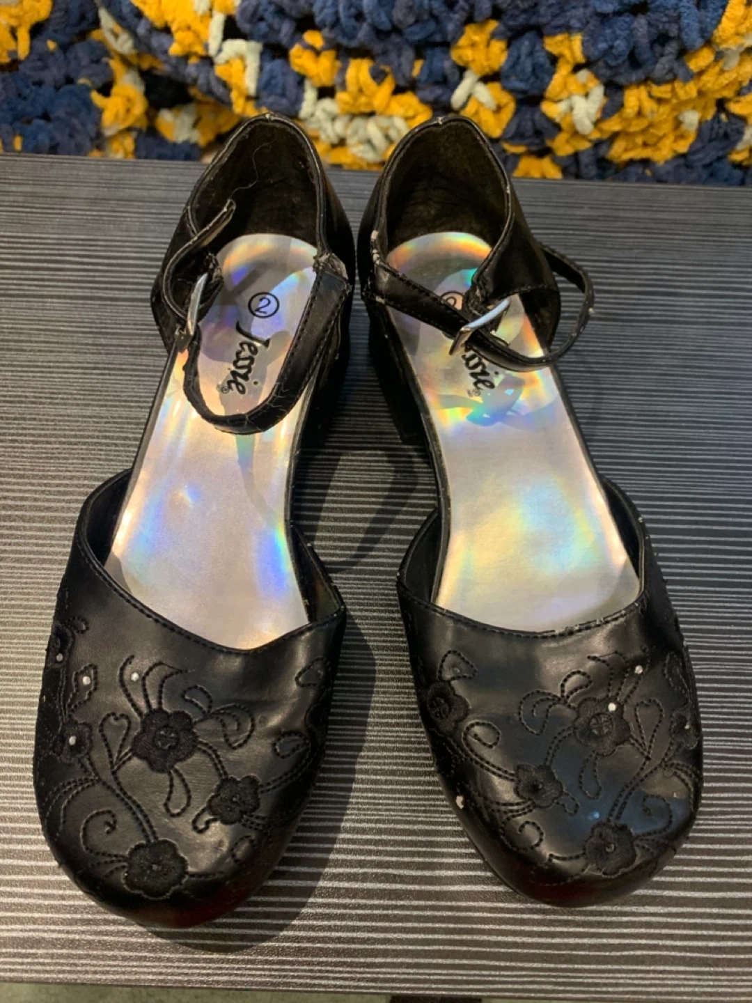 These black Jessie dress shoes feature a floral embroidery design with subtle embellishments. They have a secure ankle strap and a comfortable fit. Size is 2.