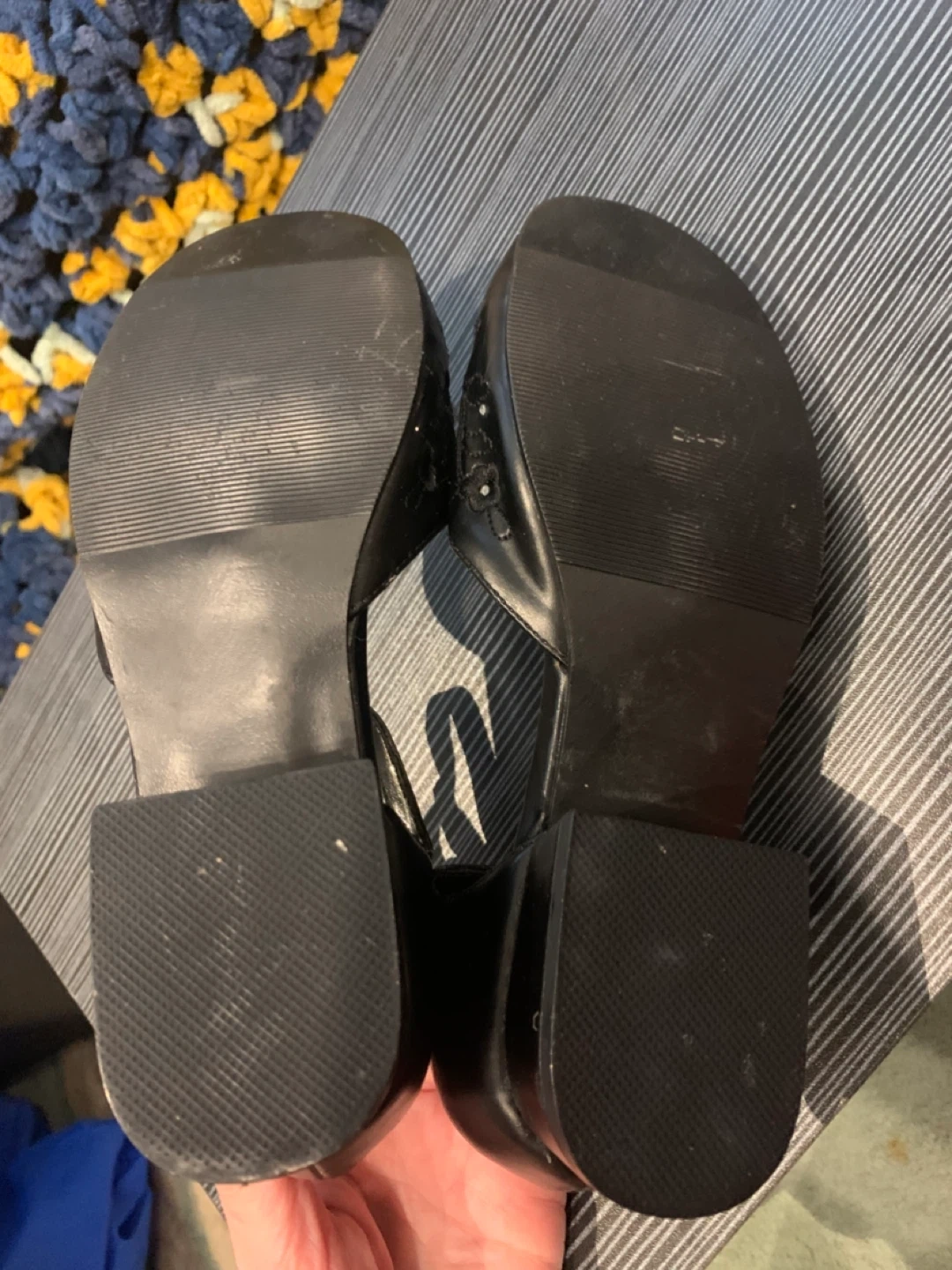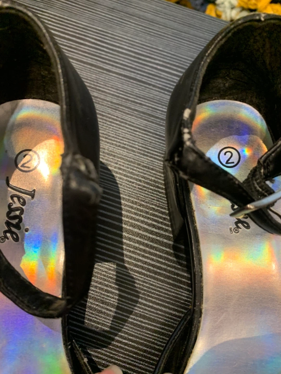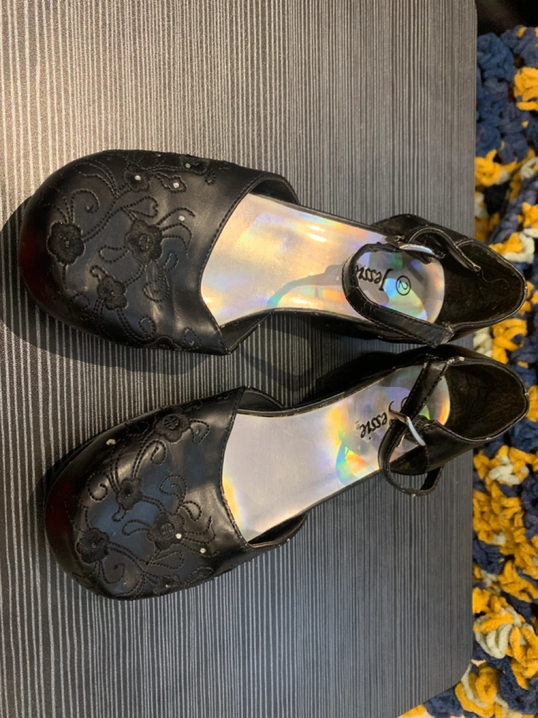 These black Jessie dress shoes feature a floral embroidery design with subtle embellishments. They have a secure ankle strap and a comfortable fit. Size is 2.