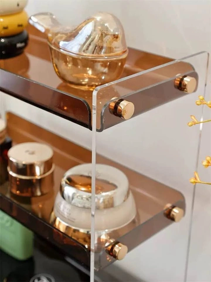 Add a touch of contemporary elegance to your home or office with this Amber & Clear Acrylic Display Shelf. This isn't just an organizer; it’s a piece of decor! Features sophisticated clear architectural side panels with rich amber-toned trays. Each tier has raised edges to keep items secure. Ideal for skincare/beauty products, perfumes, desk stationery, or small plants. Pick up only.