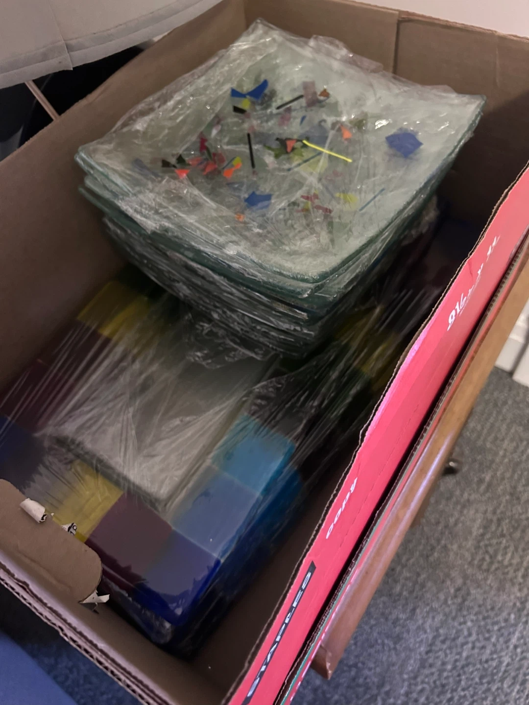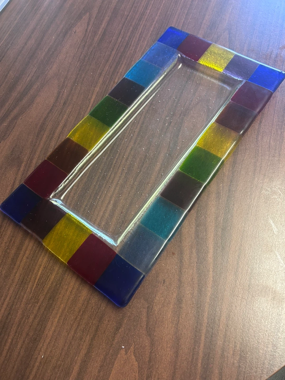 Rectangular glass serving platter with a colourful stained glass border. It measures approximately 15 inches long and 8 inches wide. This piece is great for serving appetizers or desserts.