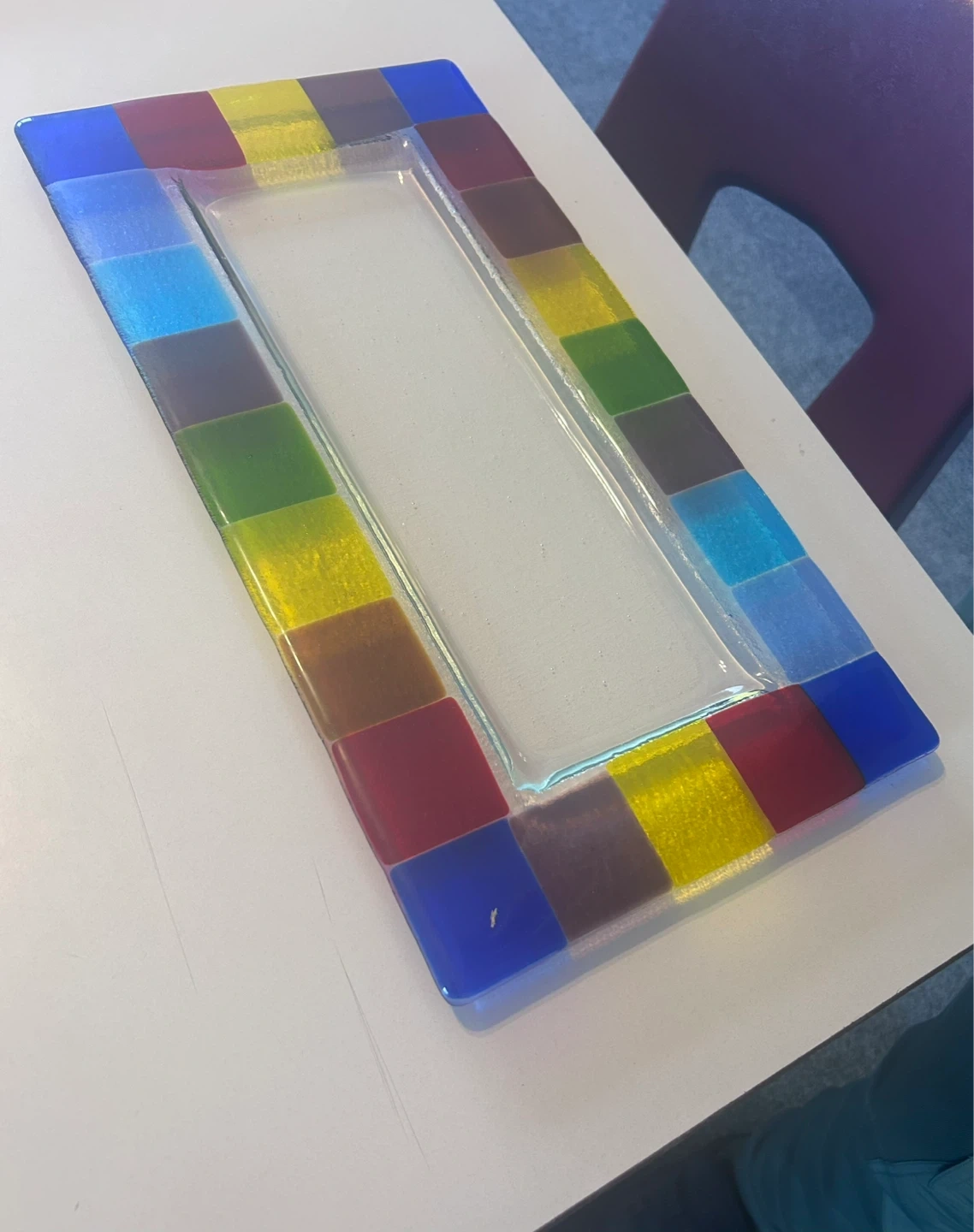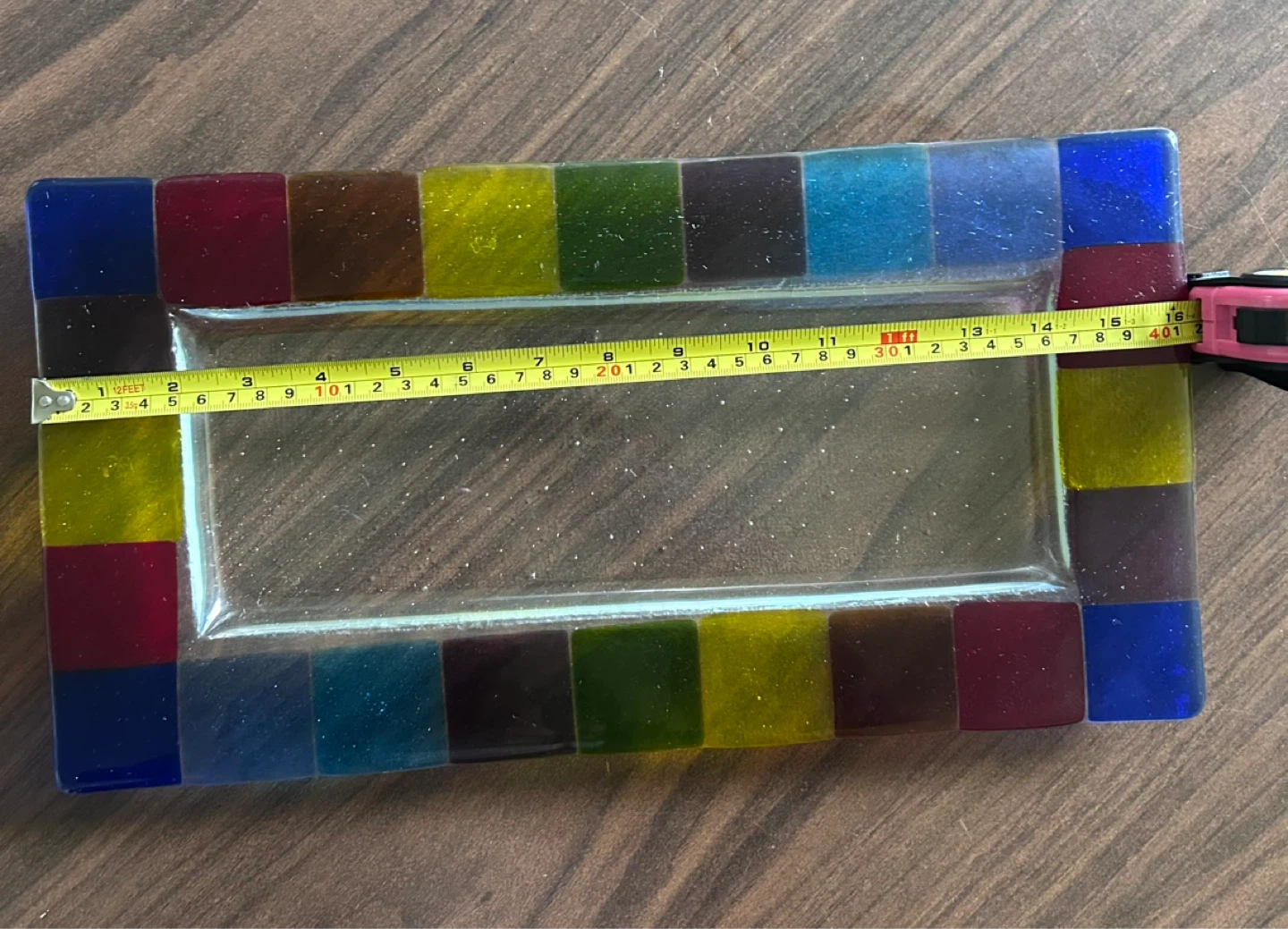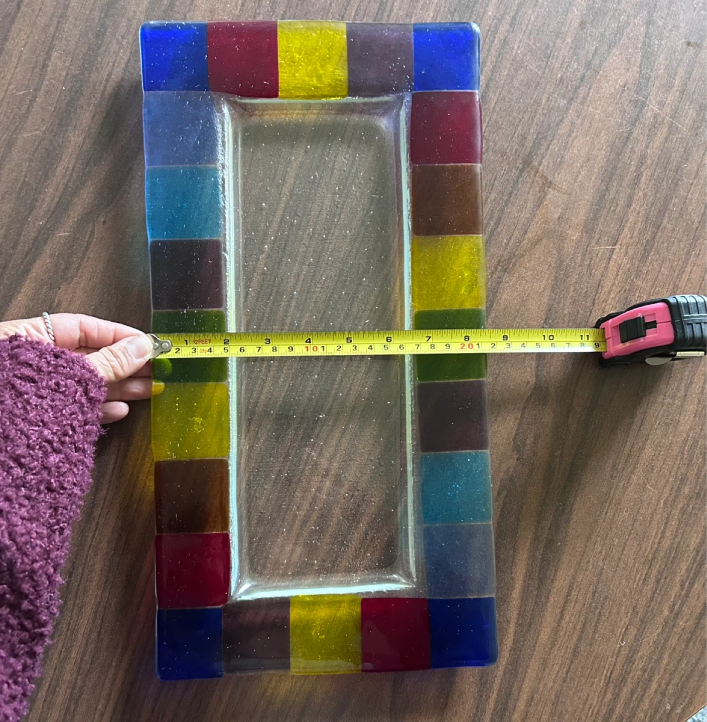 Rectangular glass serving platter with a colourful stained glass border. It measures approximately 15 inches long and 8 inches wide. This piece is great for serving appetizers or desserts.