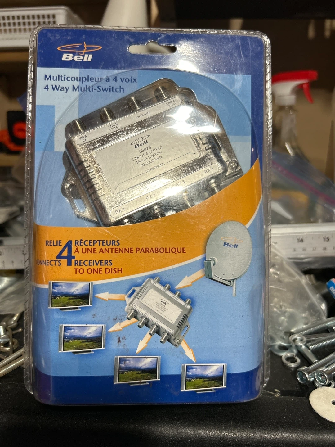 Selling a Bell 4-way multi-switch! It connects 4 receivers to one dish. It supports 3 inputs and 4 outputs, operating between 40-2200 MHz. Great for setting up multiple TVs with a single satellite dish