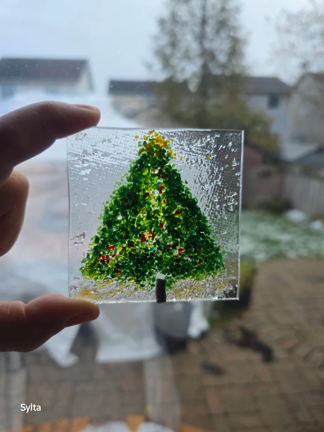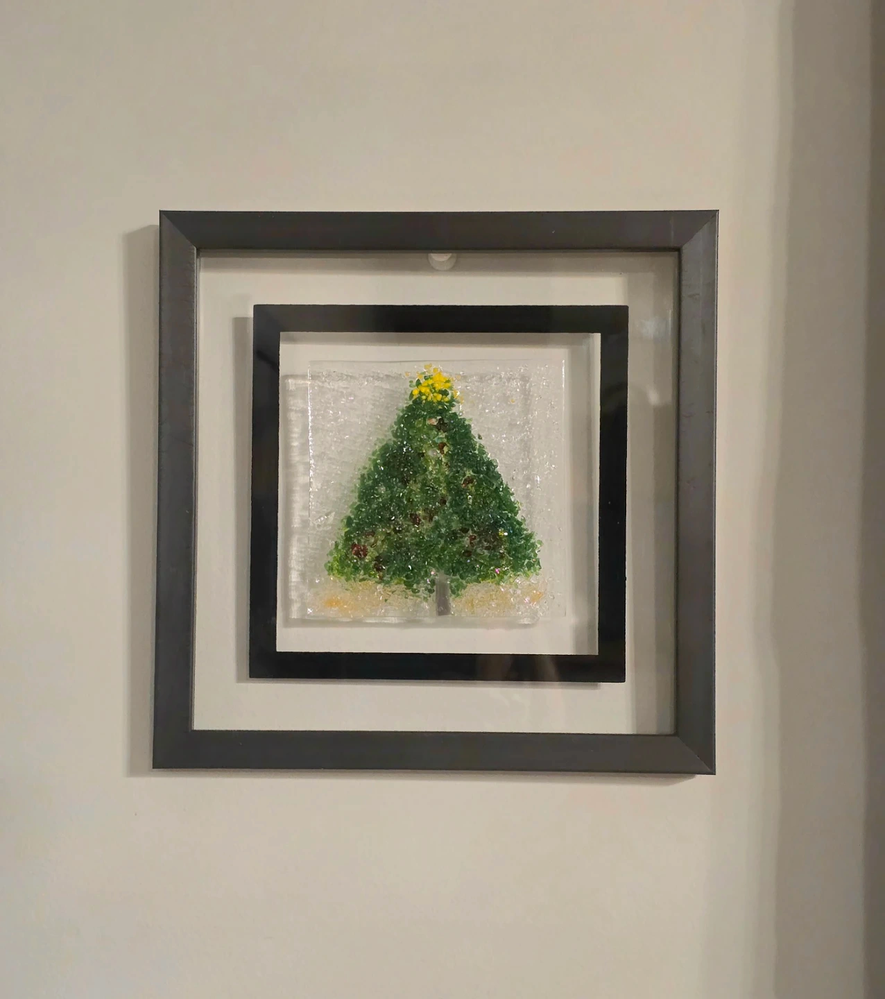 A cute little fused glass Christmas tree, on a 6 x 6" frame, created by and signed by a local artist. It's a unique piece of art that would look great in any home during the holidays