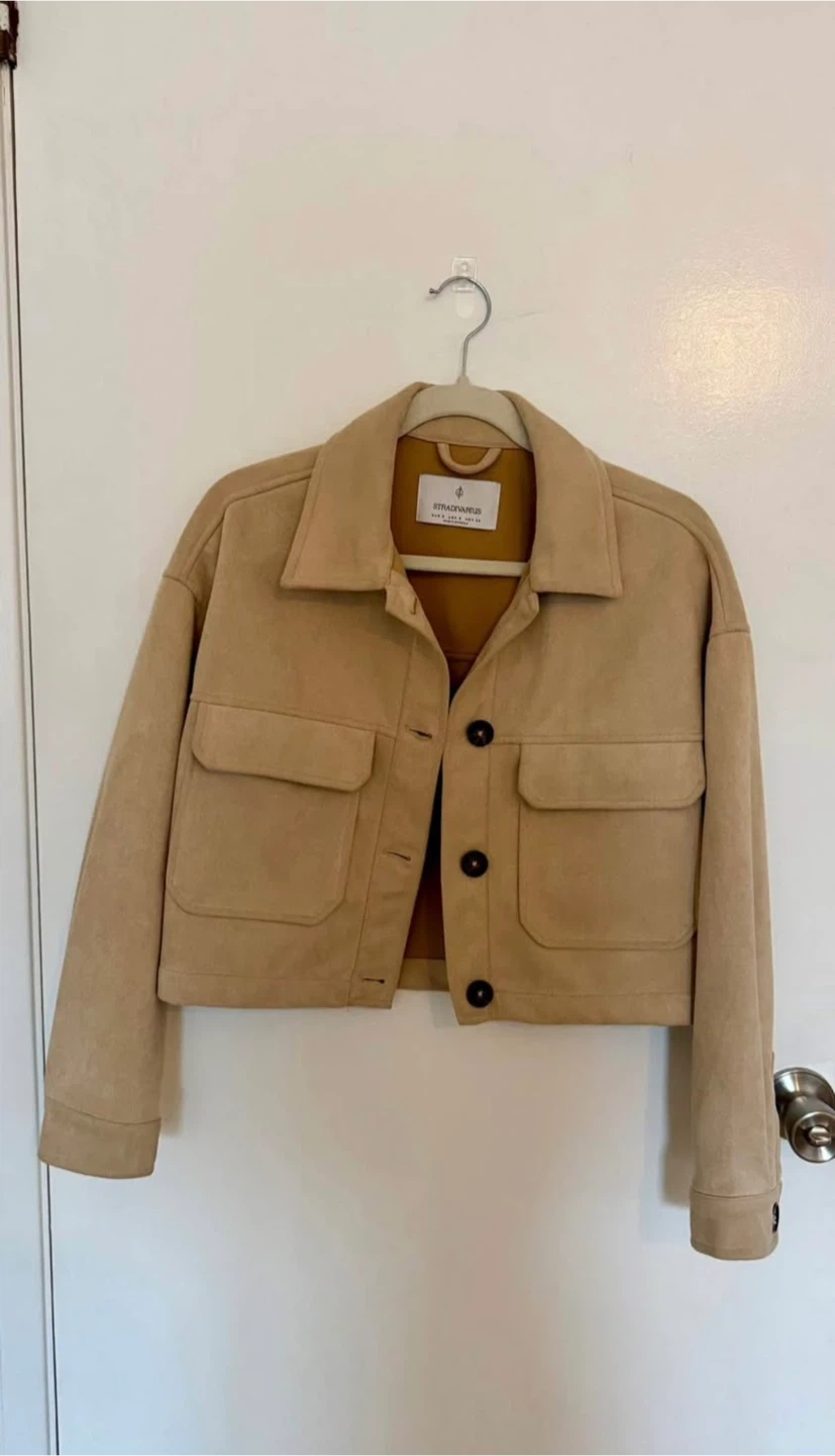 This is a beige cropped jacket from Stradivarius. It's made of a suede-like material and features two front flap pockets. The jacket has a collared neckline and a button-up front closure. It's a stylish piece perfect for layering!