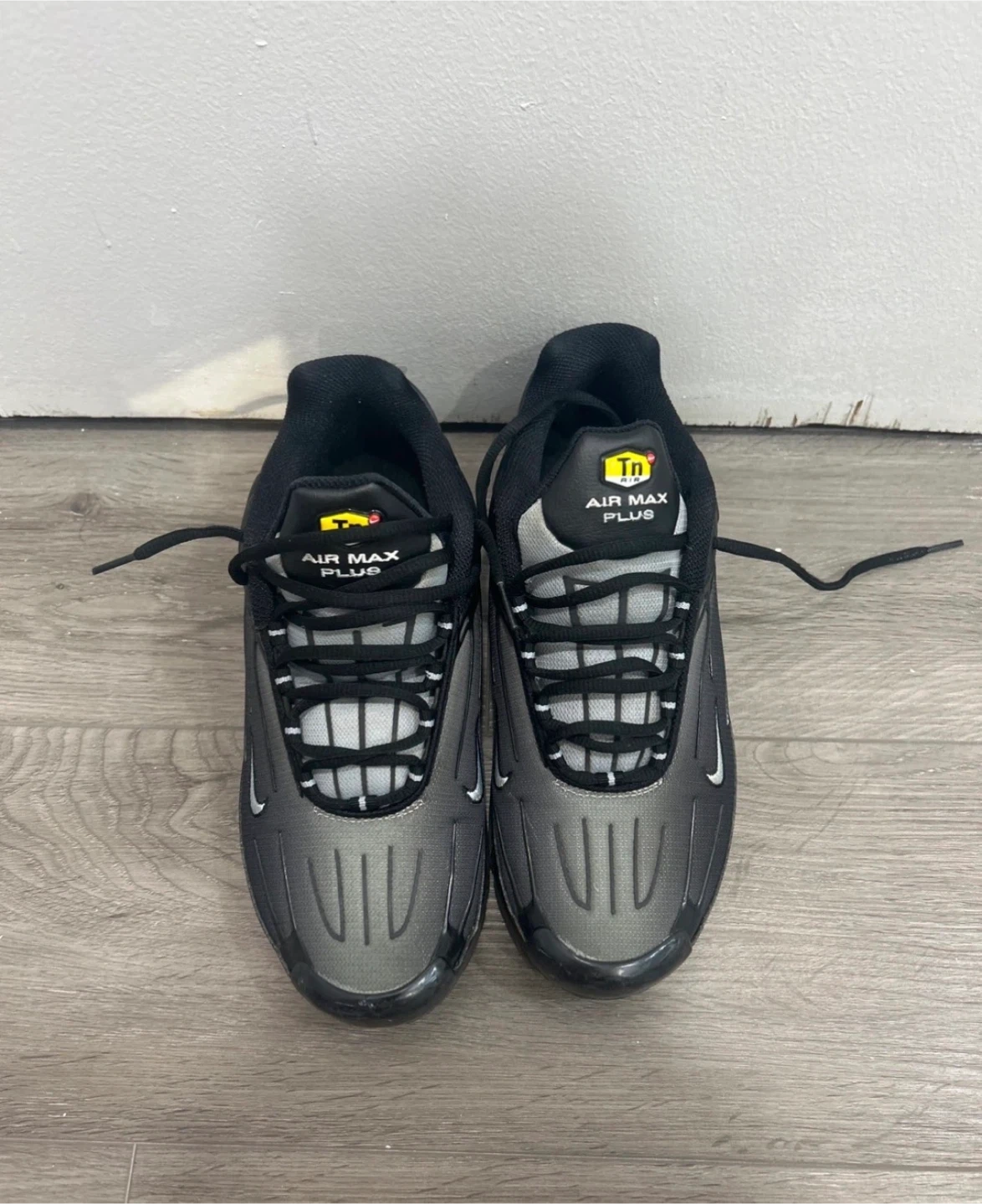 These are Nike Air Max Plus Tn sneakers. They're black and grey with a classic design. The shoes feature a mesh upper and air cushioning.
