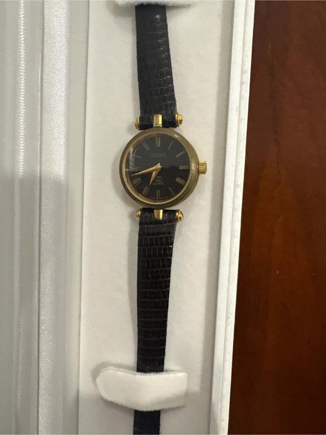 This is a classic Gucci women's watch. It features a black dial with gold-tone hands and hour markers. The watch has a black leather band with a textured finish.
