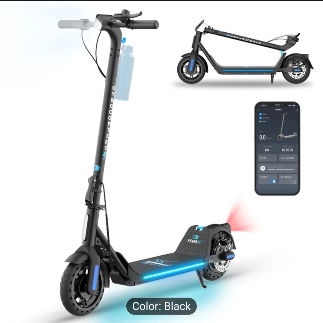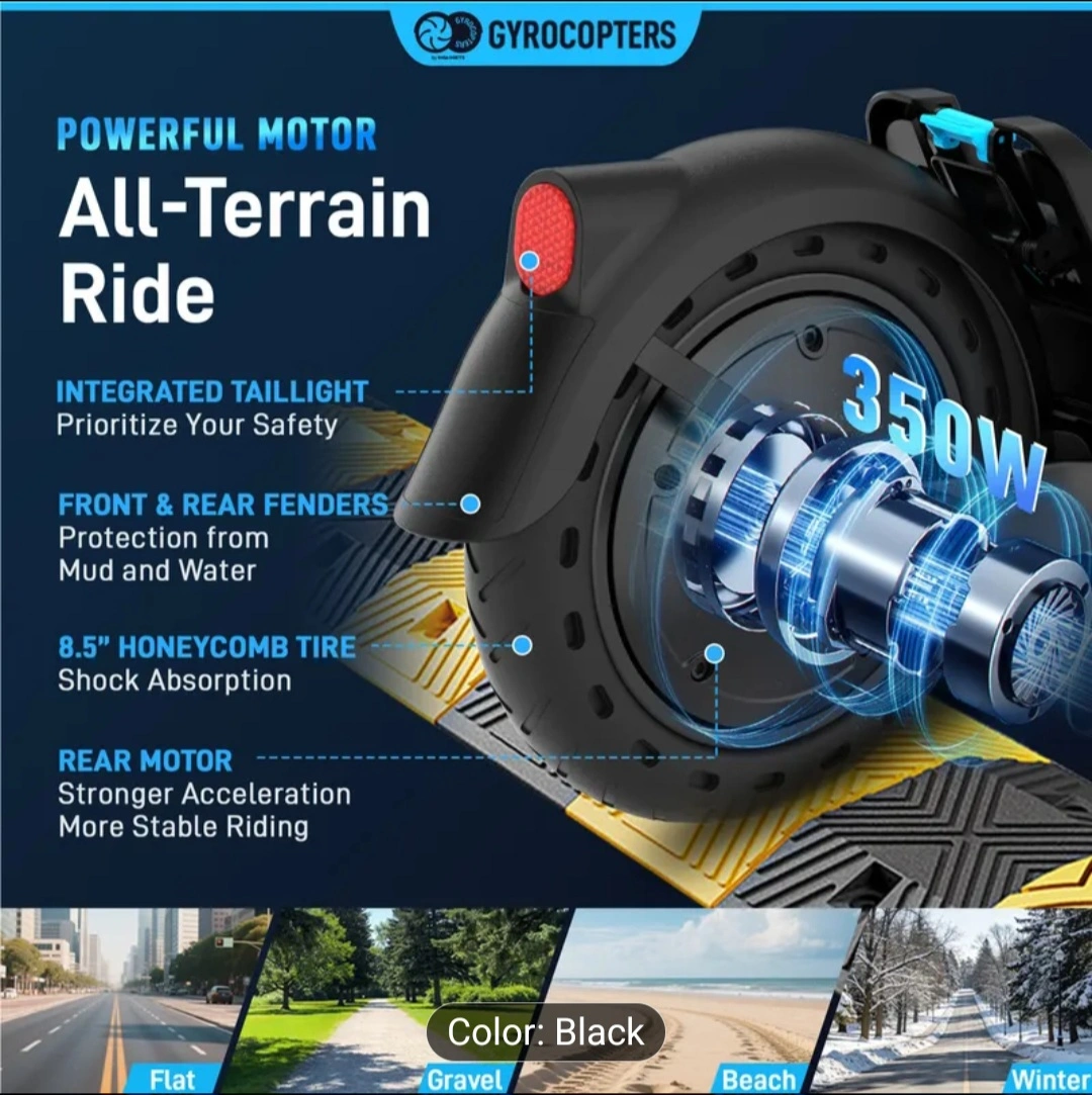 This black Gyrocopters FlashX electric scooter has a powerful 350W motor and 8.5" honeycomb tires for an all-terrain ride. It features front and rear fenders, an integrated taillight, and a rear disc brake for improved stopping power. The deck is 1.5x wider for enhanced comfort and measures 6.8"/17.3cm. It's lightweight at 14.6kg (32.2lbs) and has a compact design for easy carrying. This scooter is suitable for commuting on various surfaces like flat roads, gravel paths, and even beaches.