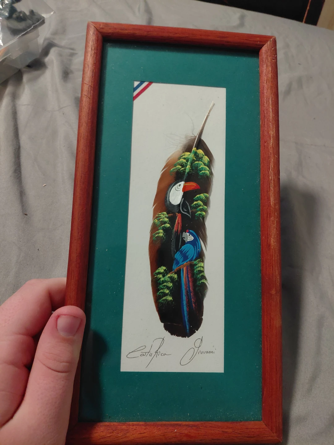 Beautifully painted feather art featuring a toucan and a macaw. The artwork is housed in a wooden frame with a teal mat. Signed "Costa Rica Giovanni".
