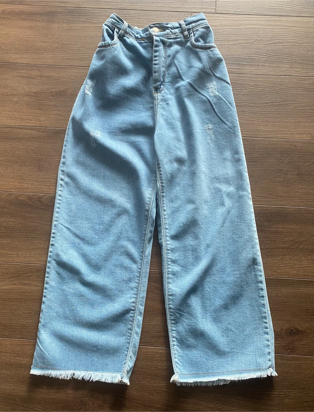 Selling a pair of light wash denim wide-leg jeans! They feature a comfortable elastic waistband and stylish frayed hems. These jeans are perfect for a casual, trendy look.
