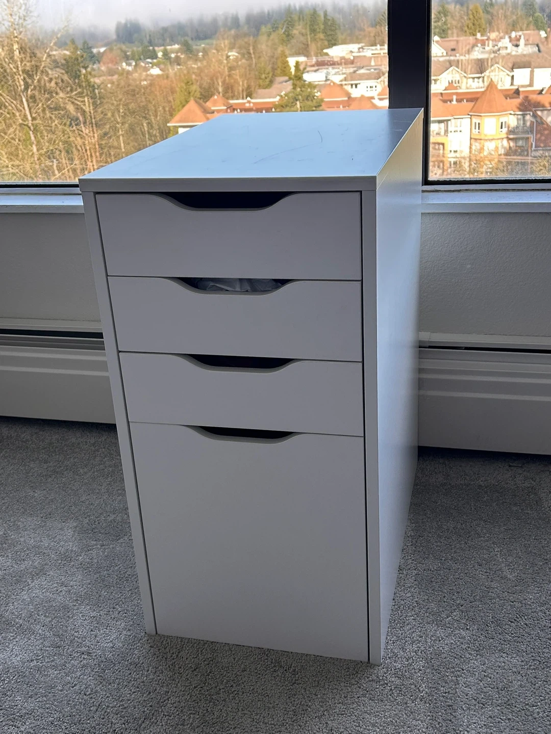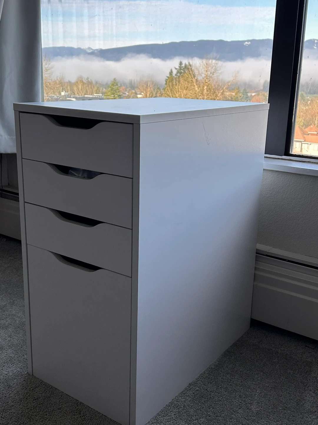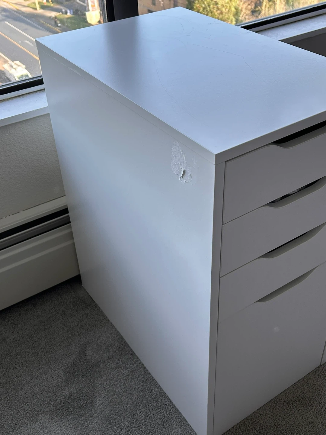 Selling an IKEA Alex drawer unit in white. It has four drawers and is perfect for a home office or bedroom. There is some damage on the side as shown in the photos.