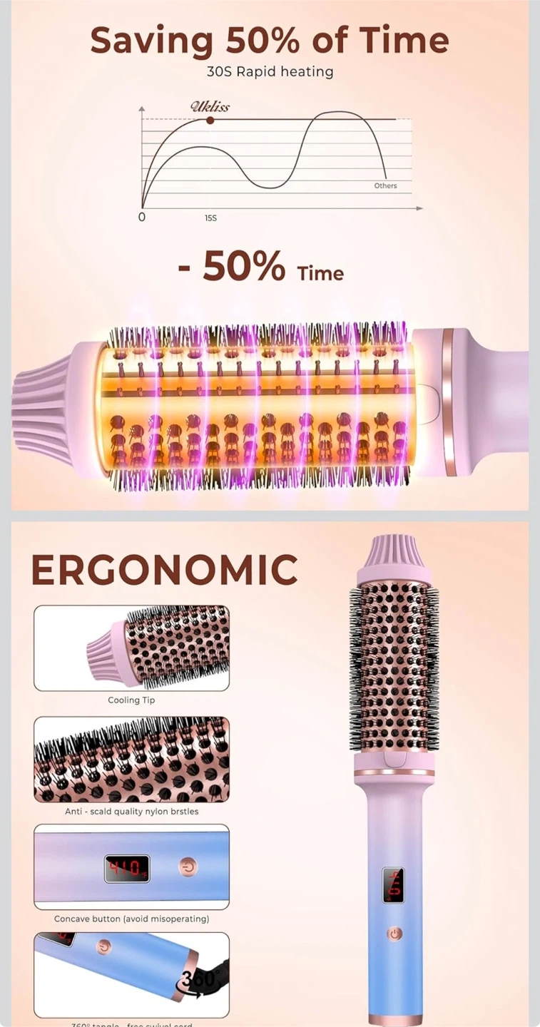 Thermal Brush,Blowout brushs,10 Temperatures LCD Display Upgrade to 400°F 1.5 in Heated Round-Brush Curling Iron Heated Ceramic Tourmaline Ionic Comb 110-240V Volum for Any Hair Type