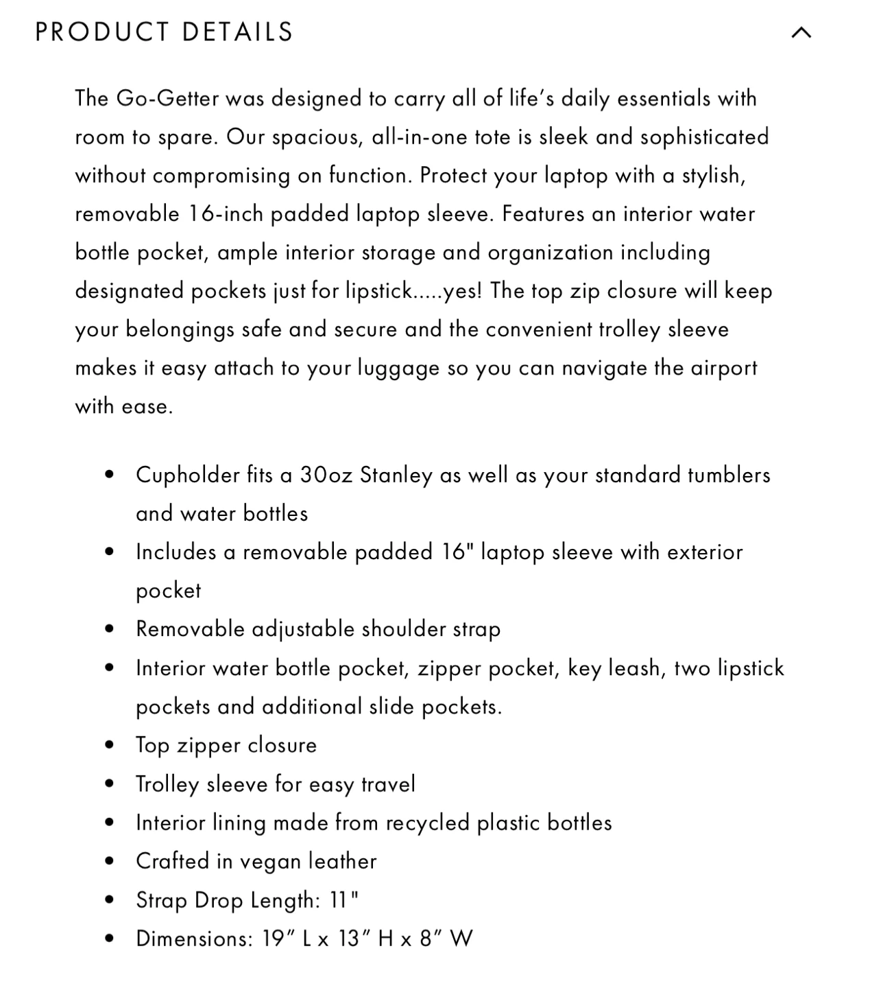 The Go-Getter Tote is designed to carry all of life’s daily essentials with room to spare. It features: