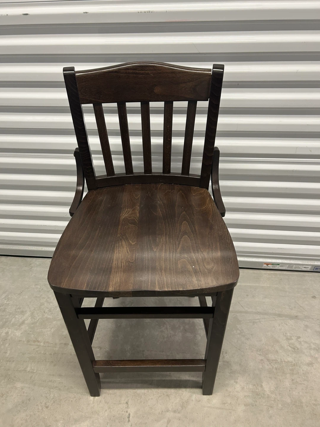 Dark brown wooden bar stool with a slatted back and contoured seat. It's made of solid wood. This stool would work well for a kitchen island or a home bar.
