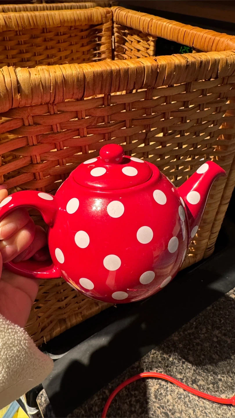 A cheerful red teapot with a classic white polka dot design. It's perfect for serving tea to guests or for a cozy afternoon. This teapot adds a fun pop of colour to any kitchen!